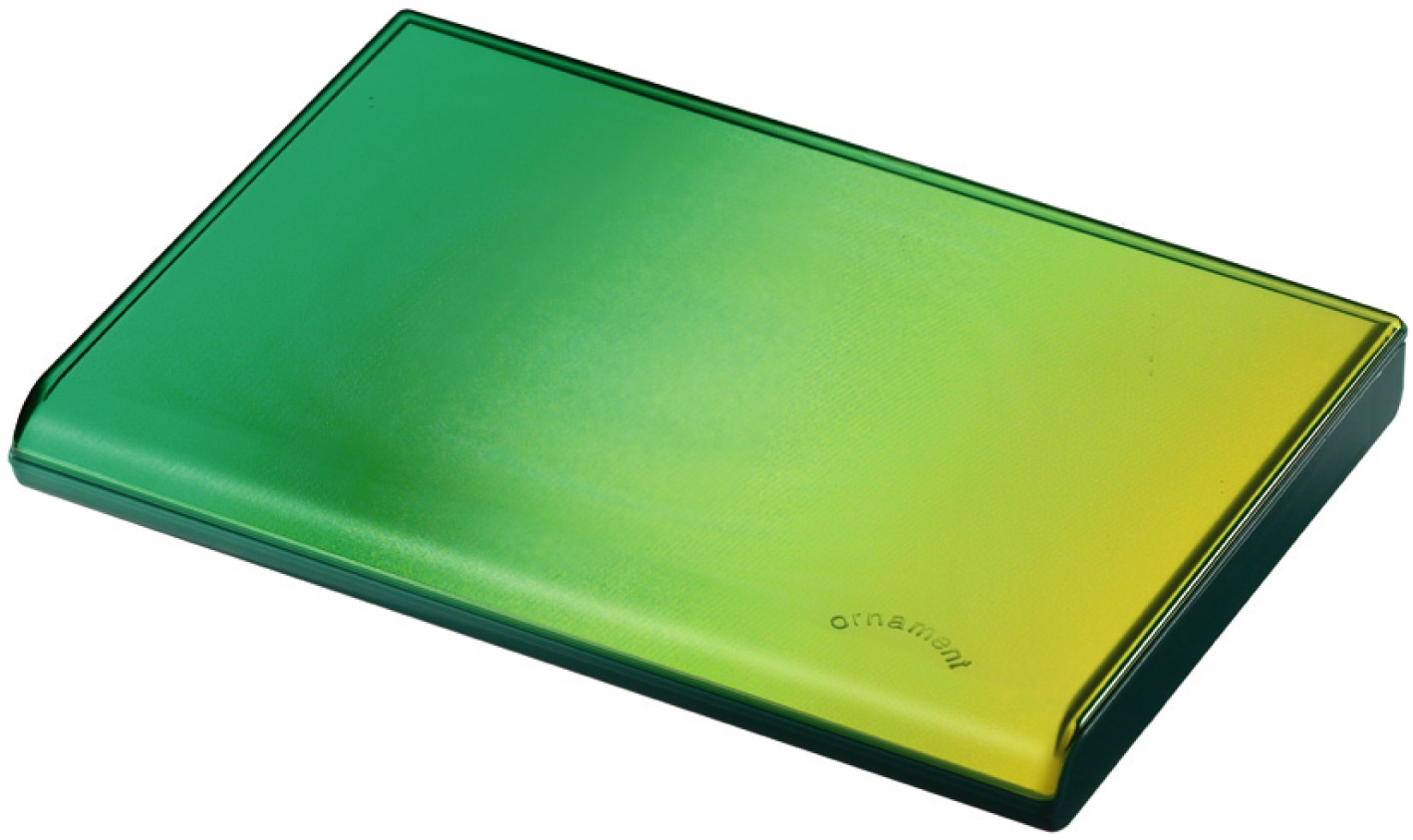 簡介 / | Ornament卡片盒 綠黃:這款名片盒擁有炫目精美的漸層外觀。深邃漸層色呈現效果源自吉田技術工坊全球首創的雙模內成型技術。握住名片盒兩側並輕輕按壓,微型減震器會緩慢打 |