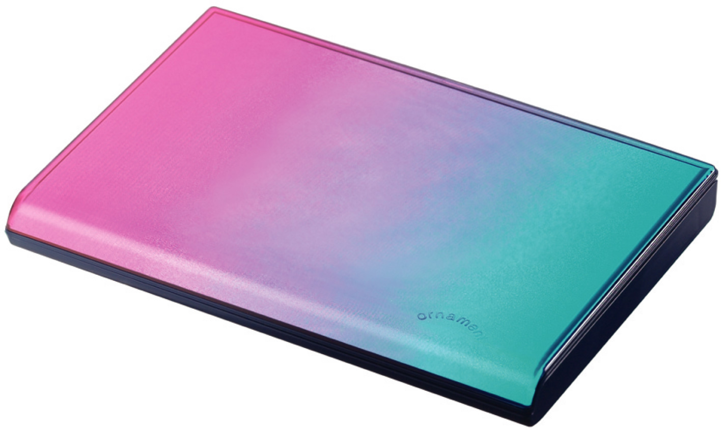 簡介 / | Ornament卡片盒 粉藍:這款名片盒擁有炫目精美的漸層外觀。深邃漸層色呈現效果源自吉田技術工坊全球首創的雙模內成型技術。握住名片盒兩側並輕輕按壓,微型減震器會緩慢打 |