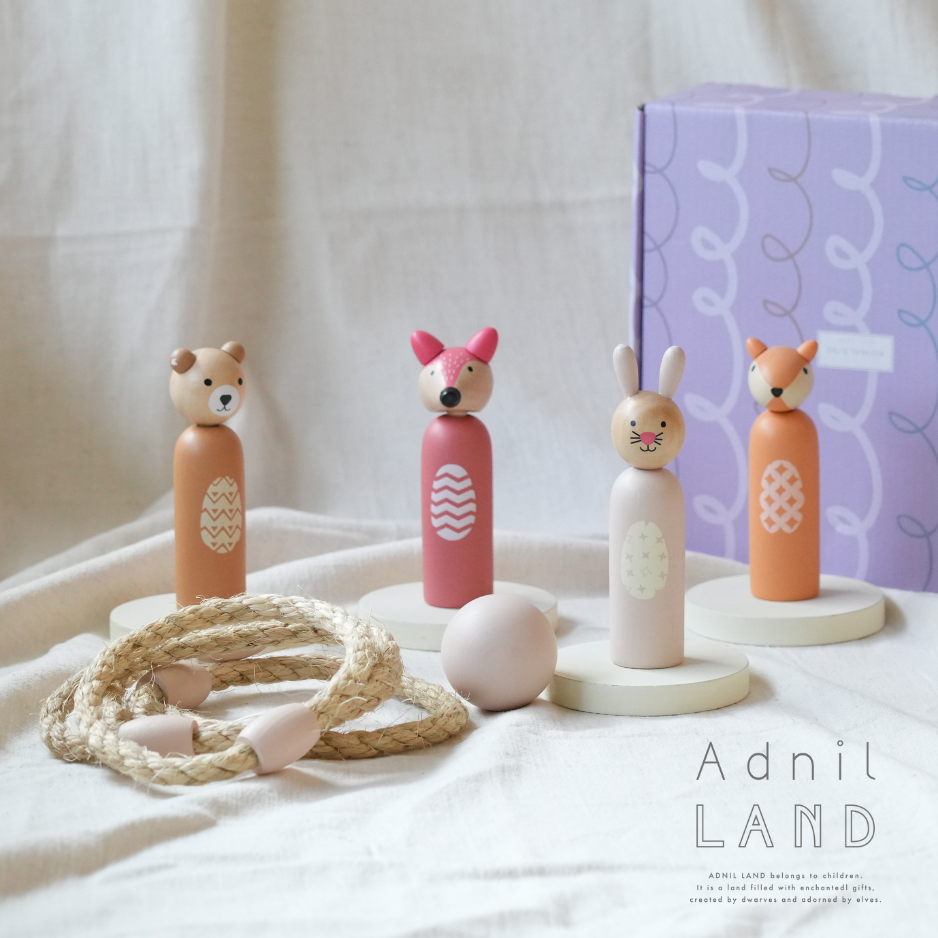 日本 Adnil LAND推出一個玩具兩種玩法,設計可愛的動物造型的木瓶,搭配木頭球就可以作為保齡球遊戲。