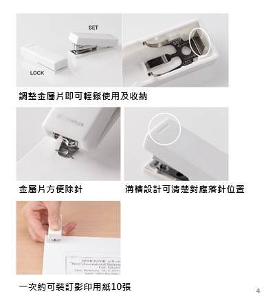調整內部金屬片還可密合機身,扁平外型更有利於收納;指壓處具備溝槽設計,讓你準確對應落針位置,一次裝訂10張都沒問題!