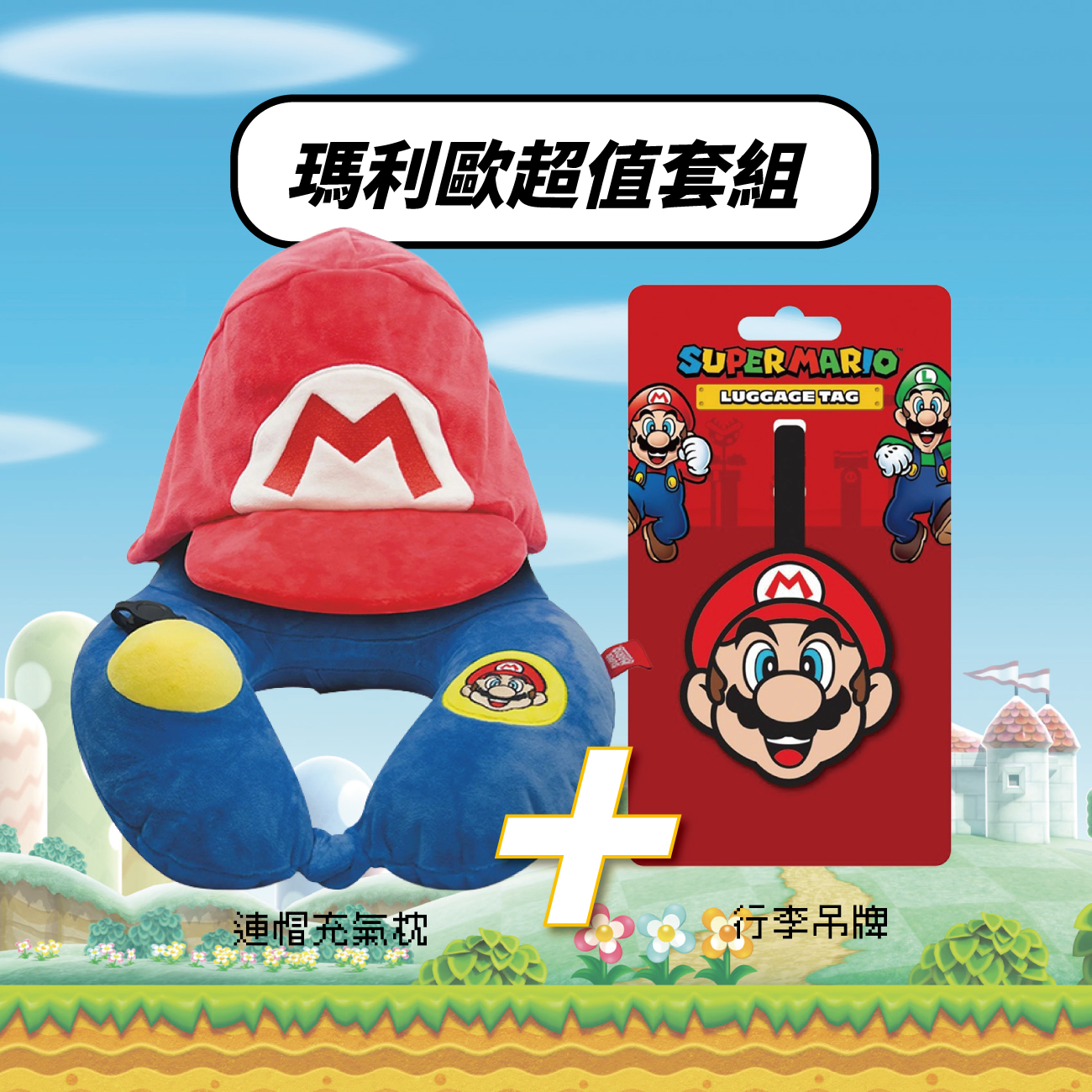Travelmall瑪利歐連帽充氣枕+行李吊牌