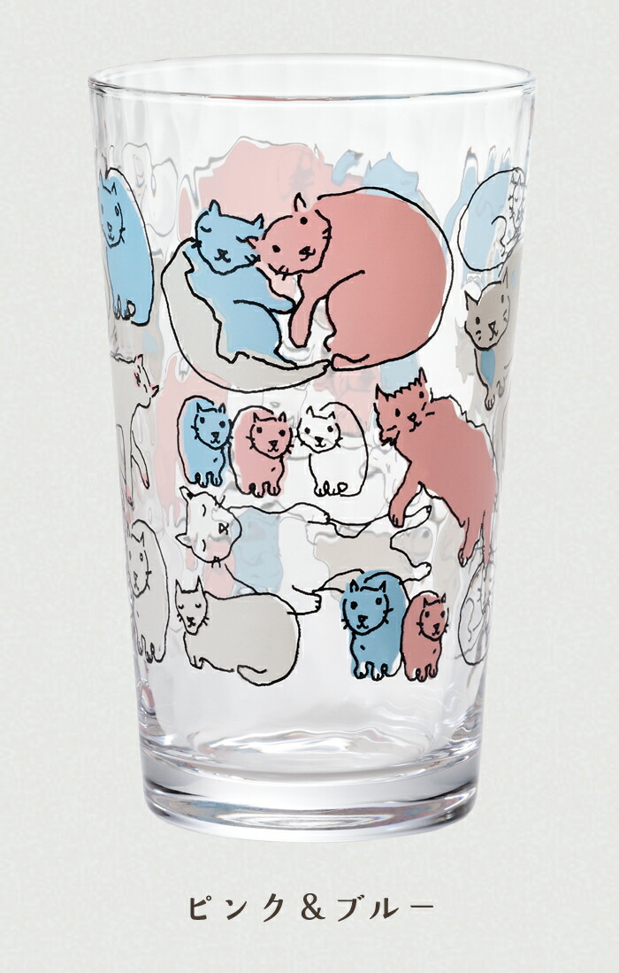 日本 ADERIA 貓貓滿屋玻璃杯 Pink+Blue