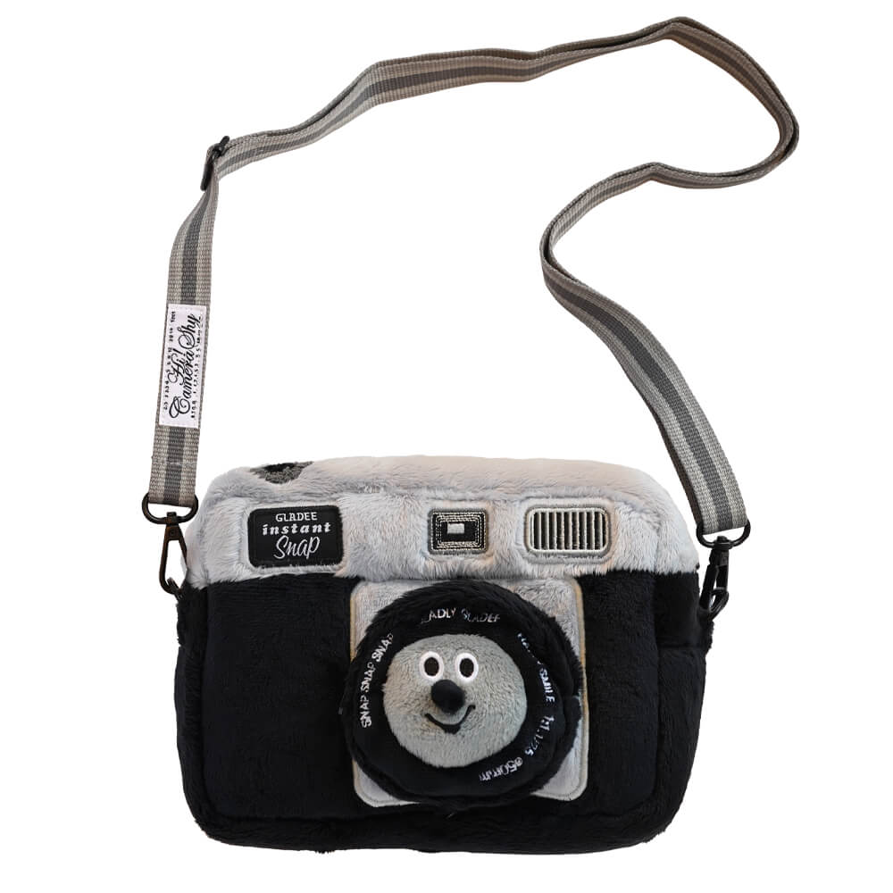 最佳賣點 : GLADEE經典黑色造型相機包 此款商品設計以放入WIDE寬景拍立得相機的尺寸為主 側面寬度很寬 除了放相機以外 也可以當作日常外出使用的小型斜背包 柔軟的毛絨布 搭配經典黑色相機造型 前面圓臉也設計有拉鍊 可放耳機包等 灰條紋斜背織帶