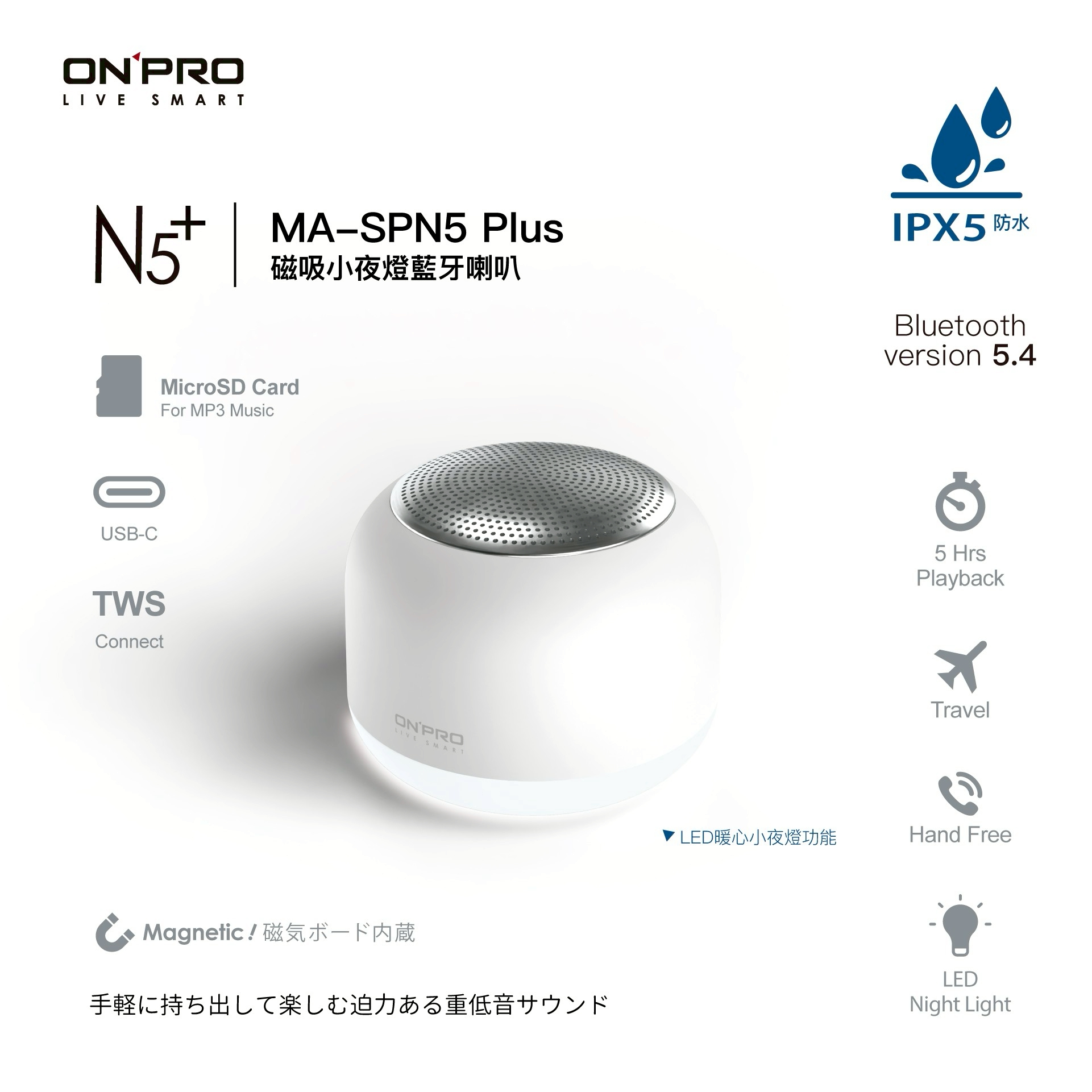 商品名 / | ONPRO MA-SPN5 Plus磁吸小夜燈藍芽喇叭 雪酪白 |