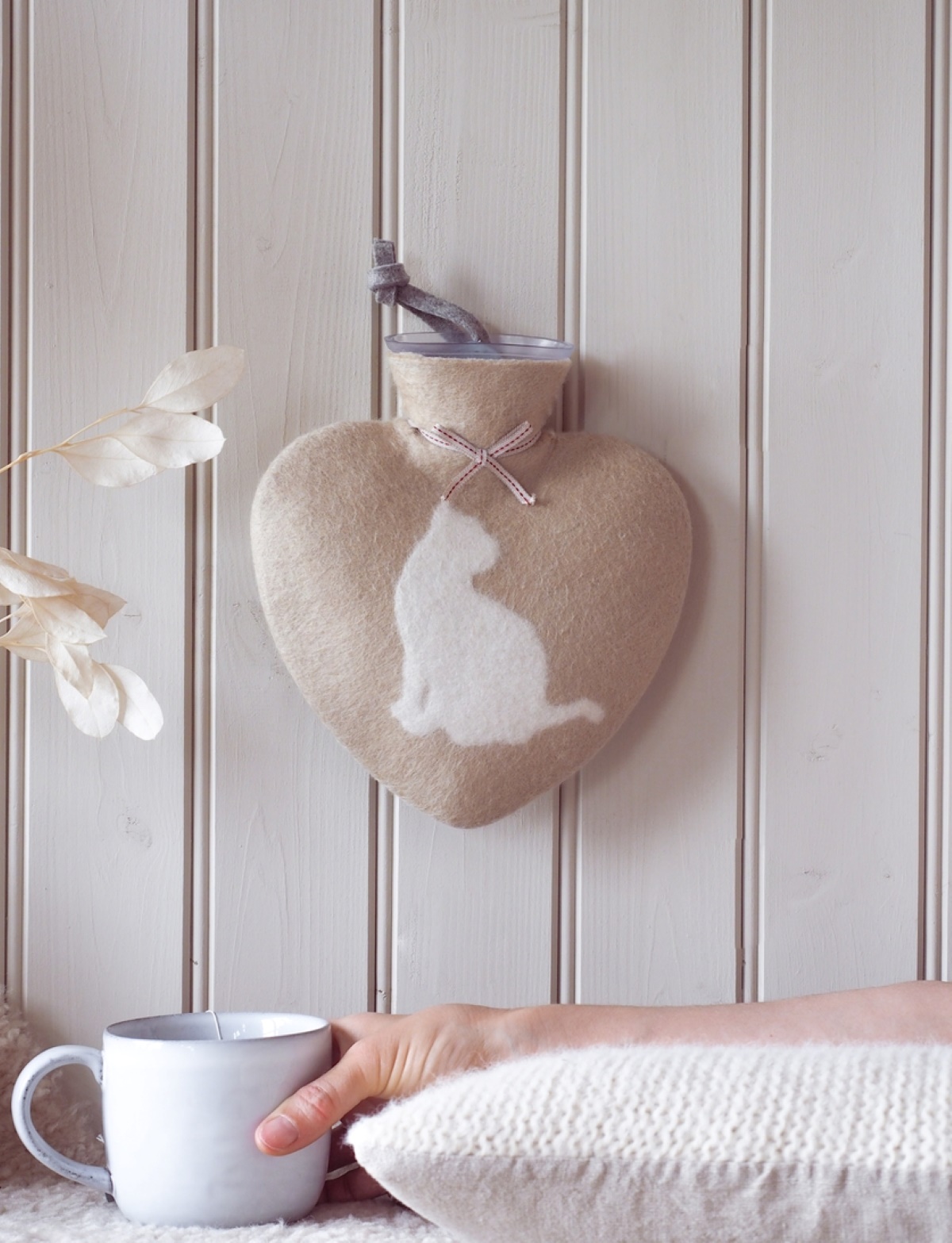 德國 dorothee lehnen 手工羊毛氈熱水袋 心型 白色貓咪 淺駝底