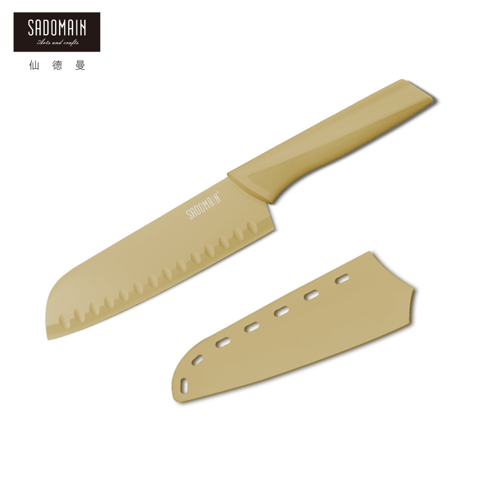 簡介 / | 【SADOMAIN 仙德曼】戶外露營用品-炫曜料理刀-沙色:耐磨耗高碳鋼材質,鋒利持久刀身披覆不沾塗層,料理不沾黏,軟式防滑握柄,手感舒適,防滑安全安全防護刀鞘設計,輕便 |
