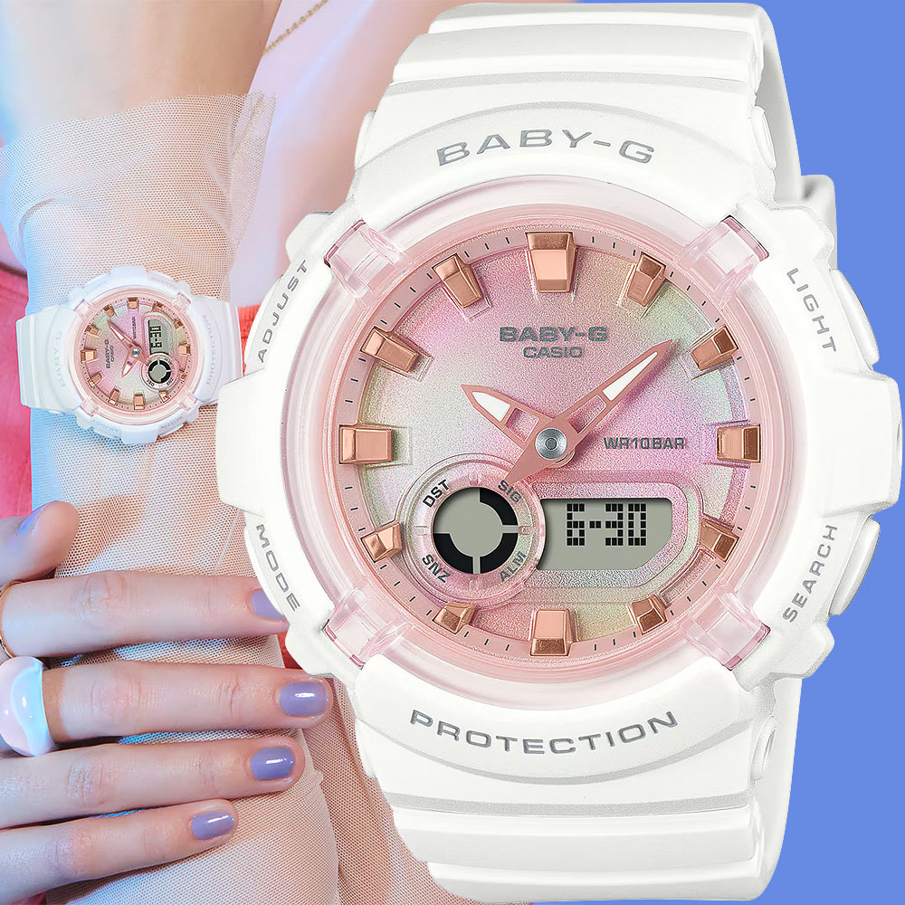 內容簡介 戴上柔和扎染外觀的 BABY-G,為您的風格增添一絲俏皮。BGA-280 採用圓形錶面設計,分層透明錶盤以柔和俏皮的顏色創造出扎染圖案,此外指針經過蒸鍍處理,增添耀眼光澤。這些手錶風格活潑但絕對實用,具有耐衝擊構造、防水 100 米等功能,可滿足您活躍的生活型態。基本資訊錶殼尺寸(長× 寬× 高):47.4 × 43.4 × 14.8 mm重量:42 g錶殼與錶圈材質:樹脂錶帶材質:樹脂錶帶構造:耐衝擊防水能力:100 公尺防水電池與電池壽命:使用 CR1220 約略為 3 年外殼:玻璃材質(礦物玻璃)相容的錶帶尺寸:125 至 180mm其他:夜光手錶功能世界時間:世界時間 29 個時區(27 個城市 + 協調格林威治平均時間)、日光節約開 關碼錶:1 秒秒錶 測量範圍:59'59 測量功能:經過時間、中途時間、第一名與第二名時間計時器:倒數定時器 測量單位:1 秒 倒數範圍:60 分鐘 倒數開始時間設定範圍:1 至 60 分鐘(增加以 1 分鐘為單位) 其他:自動重複、倒數結束鬧鈴鬧鈴 整點報時:5 個每日鬧鈴(1 個貪睡鬧鈴),整點報時照明:LED 燈(超亮照明) 選擇性照明持續時間(1.5 秒或 3 秒)、殘照機能燈光顏色:LED(白色)行事曆:全自動日曆(至 2039 年)準確度:每月 ±30 秒其他商品特色12 24 小時格式一般計時: 指針:2 根指針(時、分(指針每 20 秒移動一次)) 數位:時、分、秒、下午、月份、日期、星期保固期:1年◆鑑賞期注意事項:依照消費者保護法規定,線上購物消費者均享有商品到貨十天猶豫期之權益(並非試用期喔)。商品必須是全新狀態(不得有刮傷或拆封試戴),以及附上廠商原付所有附隨文件或資料之完整性(出貨時均有錄影詳列品項),才能享有這項服務喔。如有隨貨附贈品,經拆封使用恕無法辦理退貨。網頁圖片因拍攝關係會與實際商品略有色差,圖片僅供參考,顏色請以實際收到之商品為準。◆售後服務事項:商品於保固期內有故障或需做售後服務維修時(外觀不在保固內),依各品牌商之規定,以維修方式處理,一律需提供原廠保證書由原供應商送回品牌商做售後服務處理追蹤。 超出保固服務範圍或期限者,其維修,收費事宜,依原廠售後服務中心為基準 售後服務中心為基準。