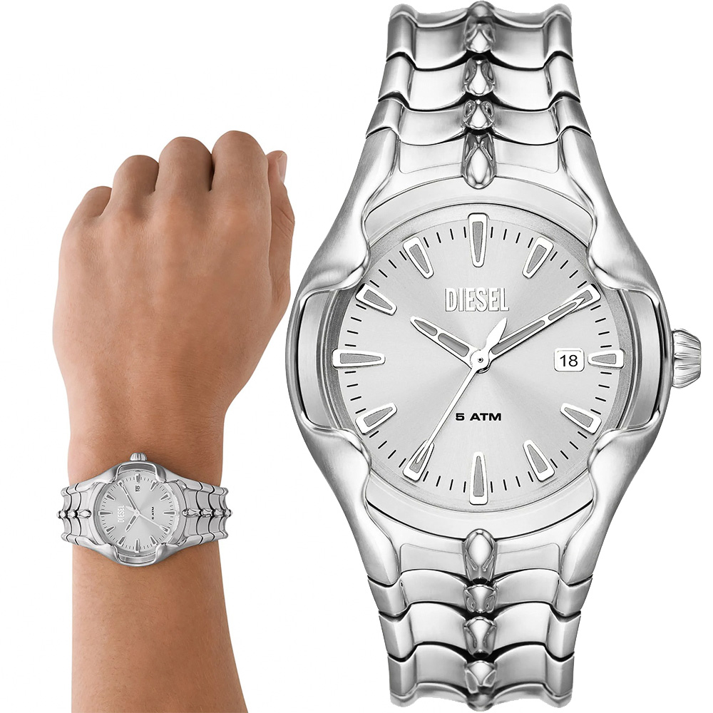 內容簡介 原廠公司貨,時尚經典潮牌金屬脊柱造型錶帶呈現未來感十足的變異風格經典大三針,散發前衛時尚的青春氣息 由 Glenn Martens 設計,VERT 是款虛擬實境中誕生的 Diesel 腕錶,於設計過程中運用全新形式的 3D 概念建模。這款腕錶將前衛破格與有機流動的設計帶到手腕之上,重新定義未來風格。具備日期視窗,經典時、分、秒大三針顯示,及採用不鏽鋼材質錶殼整體設計以大膽、叛逆的風格挑戰傳統,不只是時尚配件,更是一種態度的展現來自義大利的 Diesel,從不隨波逐流,而是領導潮流、挑戰常規品牌以大膽不羈的設計風格,成為個性配戴者的時代象徵手錶延續品牌精神,以獨特的設計手法,解構與重組傳統製錶框架,打造多層次視覺空間感。展現品牌特有的時尚指標——既叛逆、粗獷,卻又蘊含細膩的設計巧思。這不只是計時工具,更是讓你在群眾中脫穎而出的自我宣言每一只 Diesel 手錶,都代表一種態度:不隨俗、不妥協,敢做自己※基本資料※料號:DZ2185機芯:石英錶 動力:電池※規格※錶殼:直徑約44mm 鏡面:直徑約35mm錶帶:寬約24mm,長約19cm厚度:約12mm 重量:約171g※顏色※錶盤:銀色系 錶帶:銀色系錶框:銀色系※材質※錶殼:不鏽鋼 錶帶:不鏽鋼鏡面:礦物玻璃※其他規格※錶扣:按壓式摺疊錶扣 防水:50米功能:日期顯示配件:原廠精緻錶盒,原廠保證書(卡),保固期2年。調整錶帶:可幫您調整手圍長度,請您先依個人習慣以皮尺測量後看幾公分 (但皮帶以及橡膠錶帶材質不建議您事先調整錶帶),於收件地址欄或備註欄後方加註需裁剪之手圍長度。鑑賞期注意事項:依照消費者保護法規定,線上購物消費者均享有商品到貨猶豫期之權益(並非試用期喔),商品必須是全新狀態(不得有刮傷或拆封試戴),並附上所有廠商原隨附文件資料保持完整性(出貨時均有錄影詳列品項),才能享有退換貨服務喔。售後服務事項:商品於保固期內需做售後服務維修時,依各品牌商之規定以維修方式處理,一律需提供原廠保證書由原供應商送回品牌商做售後服務處理追蹤。超出保固服務範圍或期限者,其維修收費事宜,依原廠售後服務中心為基準