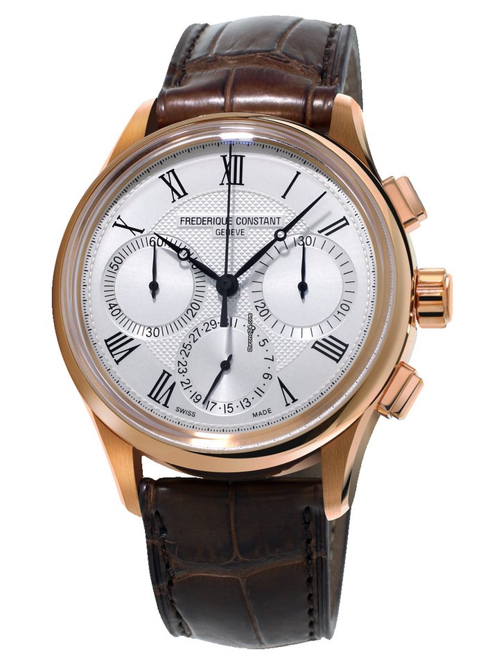 內容簡介 Frederique Constant Flyback Chronograph Manufacture康斯登自製飛返計時腕錶「飛返」(Flyback)為1930年代計時腕錶最早新增的功能之一。其原理相當簡單:按一下按鈕即可停止、重設或重新啟動計時腕錶,無須再連按三下。 這項巧思尤其可在體育賽事中連續計時,其實它須動用十分複雜的機制:以前的計時腕錶將停止、歸零及重新啟動的功能分佈在兩個按鈕依次啟動,「飛返」模式則可完美同步進行,只須按下同一按鈕一次即可。康斯登自製飛返計時腕錶所搭載的FC-760機芯不是使用導柱輪,而是星輪。更少的零件、更少的操作、更薄的厚度,使得康斯登FC-760機芯更簡約、更可靠、更流暢。料號:FC-760MC4H4機芯 動力 功能:FC-760 自動機芯,38小時動力儲存時、分、小秒針、日期、飛返計時。防水50米錶殼 錶帶:直徑約42mm,鍍玫瑰金拋光不鏽鋼錶殼棕色鱷魚皮錶帶藍寶石水晶鏡面錶盤:銀色錶盤,大秒針為秒計時功能3點鐘位置30分計時功能,6點鐘位置設日期盤,9點鐘位置小秒盤配件:原廠錶盒,原廠手提紙袋,原廠保卡,全球保固2年每款配件樣式依原廠配置服務:若需事先調整錶帶長度,可於地址欄備註手圍公分數,若有裁下的錶節將一併附上。保固期內有售後服務需求時,客戶需提供原廠保卡與商品予原供應商,由原供應商送回原廠檢查,超出保固範圍或期限者,相關收費事宜依原廠售後服務中心為基準。