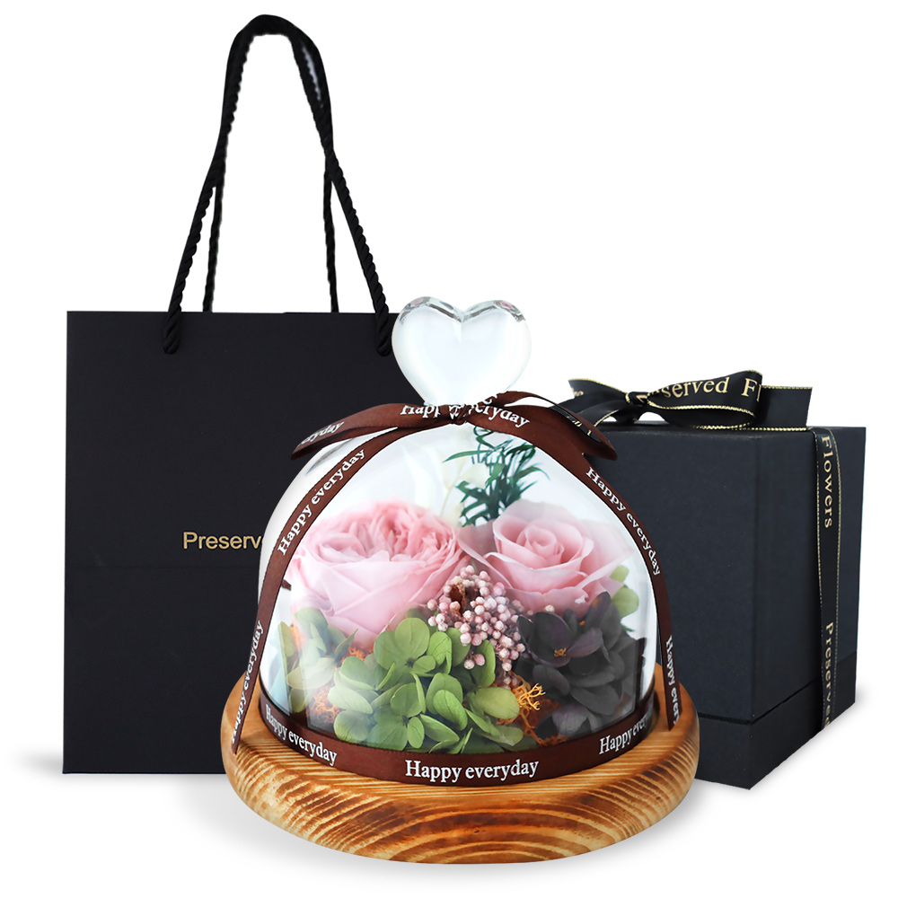 O'Pretty 歐沛媞 愛意滿分 永生花祝福愛心玻璃罩附氛圍燈+禮盒(15.4X15.4X15.8cm)-公司貨 兩朵玫瑰