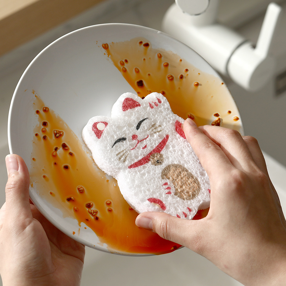 日本霜山 可愛造型木漿棉去汙清潔海綿刷-3入組 招財貓