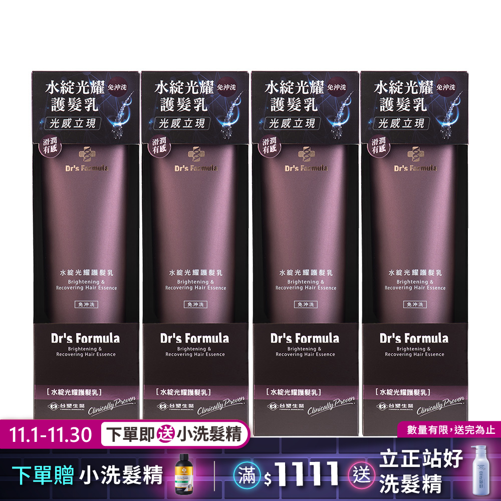內容簡介 商品規格:《台塑生醫》Dr’s Formula水綻光耀護髮乳140g*4入淨重:140g全成分:Aqua,Dimethicone,Stearyl Alcohol,Amodimethicone,Behentrimonium Methosulfate,Cetyl Alcohol,Fragrance,Bis-Cetearyl Amodimethicone,C10-18 Triglycerides,Betaine,Hydroxyethylcellulose,Butylene Glycol,C12-14 sec-Pareth-7,Cocos Nucifera Oil,Dimethiconol,Polyquaternium-37,Cetearyl Alcohol,Propylene Glycol Dicaprylate Dicaprate,Trideceth-10,Dipalmitoylethyl Hydroxyethylmonium Methosulfate,Trideceth-12,Niacinamide,Propylene glycol,Lactic Acid,PEG-100 Stearate,Ethylhexylglycerin,PPG-1 Trideceth-6,Ceteareth-20,Hydrolyzed Keratin,Trideceth-3,Sodium Nitrate,Arginine,Camellia Oleifera Seed Oil,Limnanthes Alba (Meadowfoam) Seed Oil,Phospholipids,Phytosteryl Octyldodecyl Lauroyl Glutamate,Polyquaternium-16,Linoleic Acid,Glycerin,C11-13 Isoparaffin,Phenyl Trimethicone,Disodium Phosphate,Glyoxal,Oleic acid,Sodium Citrate,Acetic acid,Wasabia Japonica Leaf Extract,Hydrolyzed Silk,Prunus Amygdalus Dulcis Oil,Palmitic acid,Glycine,Panthenol,Stearic acid,Diospyros Kaki Fruit Extract,Tocopherol,Linolenic Acid,Phenoxyethanol,Chlorphenesin,Cetrimonium Chloride,Benzyl alcohol,Zinc Sulfate用途:免沖洗護髮 使用方法:清潔完頭皮後,先將頭髮擦至半乾狀態,取約5元硬幣大小的量,抹於髮絲並輕抓延展,可依法量略為調整使用量的多寡,用後毋須沖洗。保存方法:請放置於陰涼處,勿讓陽光直射。注意事項:1. 本品建議針對髮尾進行使用,避免直接接觸頭皮2. 不得使用於三歲以下孩童。3. 避免接觸到眼睛或口鼻,若不慎接觸到眼睛,請以清水沖洗。製造業者名稱:台塑生醫科技股份有限公司製造業者地址:台北市敦化北路201號客服專線:0800-211-168製造廠地址:彰化市中山路3段359號原產地:台灣販售商廠商名稱:灝翎國際有限公司販售商地址:桃園市中壢區龍昌路180巷20號販售商電話號碼:03-4564488販售商統一編號:80718835