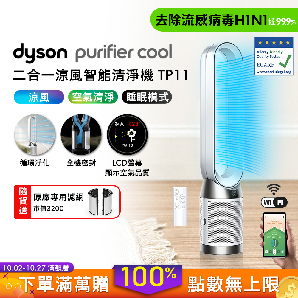 內容簡介 品牌:Dyson 品牌國別:英國品名:Dyson Purifier Cool 二合一涼風智能空氣清淨機TP11(白色)型號:Dyson TP11顏色:白色國際條碼:5025155099964製造國:馬來西亞保證期:恆隆行兩年保固商品尺寸 (mm) (HxDxW) 1050 mm x 204 mm x 120 mm (HxWxD)包裝尺寸 (mm) (HxDxW) 1103 mm x 257 mmx 260 mm (HxWxD)商品淨重(kg) 4.73 kg 商品毛重(kg) 6.85 kg配件:遙控器-白色電源:110V 60 Hz 額定功率(W):涼風 50W吹送模式:風扇模式直接吹送潔淨暖風或涼風;淨化的空氣氣流可讓您夏天涼爽怡人冬日溫暖舒適。自動模式:智能感測器偵測空氣中污染物的變化,然後自動調整風速以維護空氣潔淨安全。夜間模式:風速4以下,並降低顯示燈亮度 最大出風氣流可達(升 秒):290 公升 秒即時LCD顯示螢幕:PM2.5濃度 PM10濃度 濾網使用壽命內建智慧感測器:超微粒感應器 (PM2.5 PM10)左右擺動角度:45度, 90度, 180度, 350度氣流風速:1-10速 定時區間:1hr, 2hr, 4hr, 8hr 分貝(清淨模式):轉速10時: Max 61.4 dB(A) ; 轉速 4 時 Max 50 dB(A)複合濾網:HEPA濾網+活性碳濾網組合BSMI許可字號:R31692 NCC認證碼:CCAI20LP076AT0◎本產品網頁因拍攝關係,圖檔略有差異,實際以廠商出貨為主。◎請將插頭直接插入牆式插座。請勿使用延長線,因為超載可能會導致電線過熱並著火。*由第三方測試機構廣州市微生物研究所參考GB 21551.3-2010和T SAEPI005-2020中的方法進行測試。在實驗室規定條件下,機器放置在30m³試驗艙並運行在擴散模式10檔風速,測試90分鐘的人類冠狀病毒去除率。