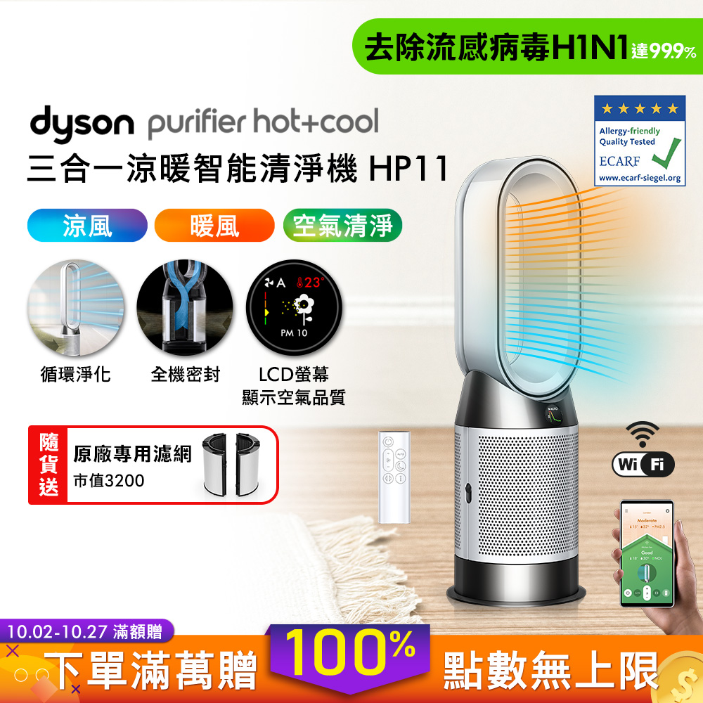 內容簡介 品牌:Dyson品牌國別:英國品名:Dyson Purifier Hot+Cool 三合一涼暖智能空氣清淨機HP11(白色)型號:Dyson HP11顏色:白色國際條碼:5025155099988製造國:馬來西亞保證期:恆隆行兩年保固商品尺寸 (mm) (HxDxW):765 mm x 205 mm x 131 mm (HxWxD)包裝尺寸 (mm) (HxDxW):823 mm x 280 mmx 280 mm (HxWxD)商品淨重(kg):5.29 kg商品毛重(kg):7.18 kg配件:遙控器-白色電源:110V 60 Hz 吹送模式:風扇模式直接吹送潔淨暖風或涼風;淨化的空氣氣流可讓您夏天涼爽怡人冬日溫暖舒適。自動模式:智能感測器偵測空氣中污染物的變化,然後自動調整風速以維護空氣潔淨安全。夜間模式:風速4以下,並降低顯示燈亮度最大出風氣流可達(升 秒) 290 公升 秒即時LCD顯示螢幕:PM2.5濃度 PM10濃度 溫度 濾網使用壽命內建智慧感測器:超微粒感應器 (PM2.5 PM10)左右擺動角度:45度、90度、180度、350度氣流風速:1-10速定時區間:30分鐘、1hr、2hr、4hr、8hr暖房目標溫度設定:精確設定目標室溫攝氏1°到37°分貝(清淨模式):轉速10時: Max 63 dB(A) ; 轉速 4 時 Max 46 dB(A)複合濾網:HEPA濾網+活性碳濾網組合BSMI許可字號:R31692NCC認證碼:CCAI20LP076AT0◎本產品暖風功能,採陶瓷加熱板加熱,出風框(口)溫度較高為正常現象,請勿直接觸摸,避免燙傷。◎本產品網頁因拍攝關係,圖檔略有差異,實際以廠商出貨為主。◎請將插頭直接插入牆式插座。請勿使用延長線,因為超載可能會導致電線過熱並著火。*由第三方測試機構廣州市微生物研究所參考GB 21551.3-2010和T SAEPI005-2020中的方法進行測試。在實驗室規定條件下,機器放置在30m³試驗艙並運行在擴散模式10檔風速,測試90分鐘的人類冠狀病毒去除率。
