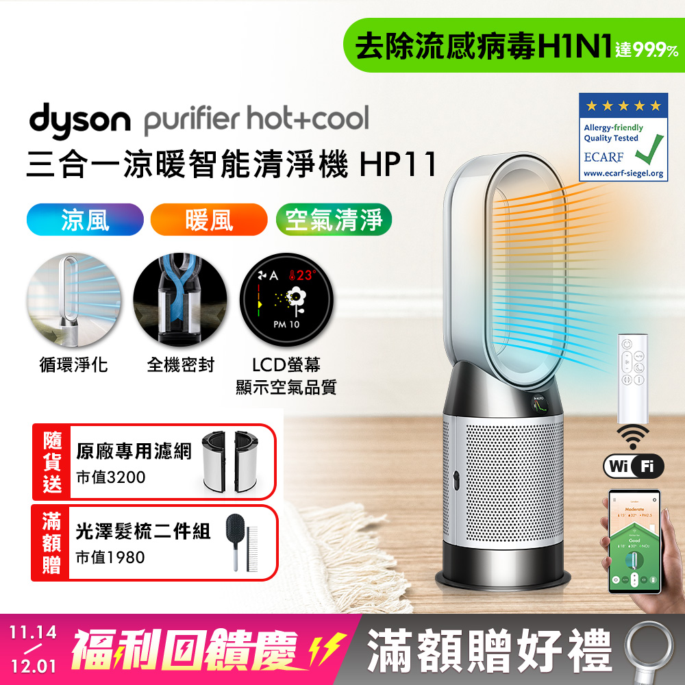 內容簡介 ★贈品專用濾網將於2026年2月28後依訂單陸續出貨★品牌:Dyson品牌國別:英國品名:Dyson Purifier Hot+Cool 三合一涼暖智能空氣清淨機HP11(白色)型號:Dyson HP11顏色:白色國際條碼:5025155099988製造國:馬來西亞保證期:恆隆行兩年保固商品尺寸 (mm) (HxDxW):765 mm x 205 mm x 131 mm (HxWxD)包裝尺寸 (mm) (HxDxW):823 mm x 280 mmx 280 mm (HxWxD)商品淨重(kg):5.29 kg商品毛重(kg):7.18 kg配件:遙控器-白色電源:110V 60 Hz 吹送模式:風扇模式直接吹送潔淨暖風或涼風;淨化的空氣氣流可讓您夏天涼爽怡人冬日溫暖舒適。自動模式:智能感測器偵測空氣中污染物的變化,然後自動調整風速以維護空氣潔淨安全。夜間模式:風速4以下,並降低顯示燈亮度最大出風氣流可達(升 秒) 290 公升 秒即時LCD顯示螢幕:PM2.5濃度 PM10濃度 溫度 濾網使用壽命內建智慧感測器:超微粒感應器 (PM2.5 PM10)左右擺動角度:45度、90度、180度、350度氣流風速:1-10速定時區間:30分鐘、1hr、2hr、4hr、8hr暖房目標溫度設定:精確設定目標室溫攝氏1°到37°分貝(清淨模式):轉速10時: Max 63 dB(A) ; 轉速 4 時 Max 46 dB(A)複合濾網:HEPA濾網+活性碳濾網組合BSMI許可字號:R31692NCC認證碼:CCAI20LP076AT0◎本產品暖風功能,採陶瓷加熱板加熱,出風框(口)溫度較高為正常現象,請勿直接觸摸,避免燙傷。◎本產品網頁因拍攝關係,圖檔略有差異,實際以廠商出貨為主。◎請將插頭直接插入牆式插座。請勿使用延長線,因為超載可能會導致電線過熱並著火。*由第三方測試機構廣州市微生物研究所參考GB 21551.3-2010和T SAEPI005-2020中的方法進行測試。在實驗室規定條件下,機器放置在30m³試驗艙並運行在擴散模式10檔風速,測試90分鐘的人類冠狀病毒去除率。