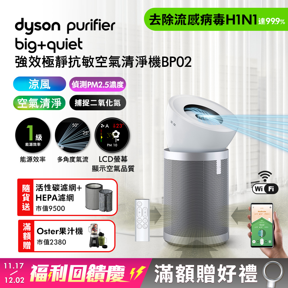【福利回饋慶】dyson Purifier Big+Quiet 強效極靜抗敏空氣清淨機 BP02 白色及柔霧銀 (贈HEPA+活性碳濾網+果汁機)
