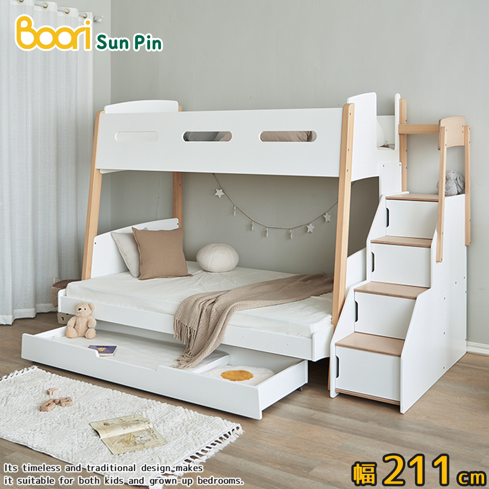 內容簡介 ◆ 澳洲 30 年兒童家具品牌◆ 南洋杉 FSC 認證木材◆ 樓梯收納櫃,上下床安心◆ 床側板加高設計,無銳角◆ 實木的床板條,特規五金◆ 實木床腳高承重,安全無虞◆ 免自行組裝,專人送貨到府◆ 此賣場不包含床底抽屜(為選配)◆ 此賣場不包含獨立筒床墊(需訂購)1993 年 Boori 第一間門市在澳洲雪梨開始營運。30 年後在全球 7 個國家有服務據點,成為全球兒童家具品牌,受到百萬家長信任。使用 FSC 認證木材,品質優良,對環境友善。透過獨特細膩的工匠技藝,讓每一件家具均是精心製作,經久耐用。 空間有限,不如善用房間的高度,騰出地方來佈置更多家具。作為母子床,能就近照顧孩子,共同生活。也可以作為兩個小孩的床鋪,讓房間不會有擁擠感,騰出的空間還能擺放才藝用品,如樂器、畫架等。 獨特的側邊梯櫃,樓梯讓小孩好上下床,並有四個收納櫃,可放繪本、玩具、布偶,讓房間井然有序。主材是南洋杉,木質堅韌,經久耐用。原產地澳洲常用於家具、建築,也常見於小木屋的板材。上下層床之間,有餘裕的高度可避免碰撞頭部,讓入睡起身更加安全。孩子睡姿多變、活潑好動,因此設計師加高上層床四周床板,讓小孩不用擔心翻身,安心入眠。床側板無銳角,圓角邊緣不刮手、好抓握。實木床板條間隙密集,床架更加穩固不易搖晃,承重 100kg。實木床腳,結構穩固不搖晃,高承重安全無虞,安心入眠。精緻特規五金,使用更加穩固的組裝設計,提升抗衝擊力與結構強度,經久使用。 賣場不包含床墊、床底抽屜,推薦選配 Boori 專屬獨立筒床墊。 注意事項:・實木家具因木節、木紋獨一無二的自然生長現象,照片與商品有所不同。※商品可能因拍攝產生色差,圖片僅供參考,商品依實際供貨樣式為準。※購買前請仔細考慮後再下單,若非商品瑕疵而無故退貨,來回配送會造成商品損耗而難以再販售,我司將蒙受損失。對商品有疑慮,請先用問與答或電洽,將有專人為您服務,確認需求後,請再購買。※本商品尺寸材積,已屬台灣貨運界總的大型家具類別,故以無法委託貨運配送,須由我司專人約定配送。依個人需求及地區不同,配送時間約 3~10 日工作天。※商品到貨 7 日內為鑑賞期(鑑賞期非試用期),若「非商品本身瑕疵」或配送過程導致瑕疵問題,需酌收退貨運費 $1,500~3,000 元。※台灣目前的貨運物流已不承接大材積家具配送。我司為北部供應商,彰化以南、花蓮台東地區已列為專車配送之區域,如欲訂購請洽我司詢問,該地區需補貼之專車費用 $1,000~4,000元。※大型商品專人專車配送,若因個人觀感或無自行確認樓梯、電梯及進出口尺寸,與地形地物限制而無法進入,導致退換貨品情形「來回運費」需由消費者自行負擔費用。※大型家具實屬難度配送,需派專車多員同時服務,請消費者體諒。購物前請審慎考量,勿隨意下單、退貨。※商品如經拆封、使用、或拆解以致缺乏完整性及失去再販售價值時,恕無法退(換)貨!請保持商品、附件、包裝、說明書等完好。※商品若需組裝服務,可洽詢客服報價。※無回收家具服務,若需回收可聯絡當地清潔隊處理,免付費清運專線 0800-085-717※送達地點有否限制:限台灣本島地區,外島恕不接單。※運送限制說明:以下地區因屬偏遠地區運送成本高,消費者需自行分擔運費,待運費報價同意後開始接單,敬請見諒! 1. 新竹:尖石鄉、五峰鄉 2. 苗栗:泰安鄉 3. 台中:梨山、谷關、環山、和平鄉 4. 南投:鹿谷鄉、仁愛鄉 5. 雲林:古坑鄉 6. 嘉義:阿里山鄉、梅山鄉、嘉義農場 7. 高雄:內門鄉、杉林鄉、甲仙鄉、六龜鄉、甲仙鄉(小林村)、六龜鄉(寶來村) 8. 屏東:霧台鄉、春日鄉、泰武鄉、三地門鄉 9. 宜蘭:大同鄉、南澳鄉 10. 花蓮:秀林鄉、池上鄉、海端鄉 11. 台東:長濱鄉、東河鄉(北源村)、台東地區(牧場&監獄)。 免自行組裝,專人送貨到府產品尺寸:W260*D143.5*H185.6 cm外箱尺寸:W149*D70*H13 cm 等共計3件淨重:115 kg毛重:121 kg承重:單層床板 100kg材質:南洋杉、橡膠木、多層板顏色:薏米白