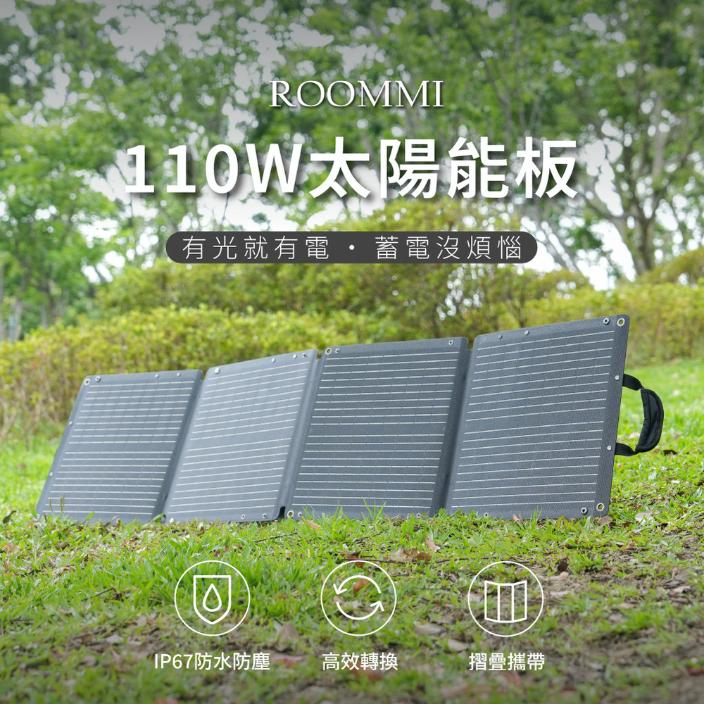 內容簡介 https: www.youtube.com watch?v=F9ePlYt8bHIROOMMI太陽能充電板,嚴選優質太陽能電池,讓你走到哪充到哪,隨時累積電能,戶外露營、登山健走都可安心用!- 發電效率高達22 - 25%發電效率- 面防塵、防潑水處理- 使用日本進口單晶矽- 摺疊設計,方便攜帶- 支援USB DC充電,手機、行動電源也可用產品名稱:110W太陽能板太陽能板類型:單晶矽單片太陽能板厚度:4.3mm折疊數量: 4pcs轉換率:22%太陽能板總功率:110W Max輸出電壓: 19.44V功率公差:10%太陽能板表面材質:ETFE膜輸出介面:USB-A 24W Max (5V 3.4A, 9V 2.5A, 12V 2A) USB-C PD 18W Max (5V 3A, 9V 2A, 12V 1.5A) DC19.44V 5.65A材質:單晶矽+牛津布面實際重量:2.5kg折疊整體總尺寸:40x39x3cm展開尺寸: 156x40x1.7cm顏色:黑色保固:一年