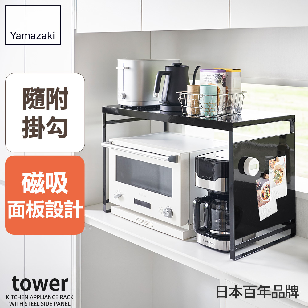 商品描述 | 日本【YAMAZAKI】tower可磁吸廚房置物架(黑):★廚房各式家電一次整理收納★磁吸面板可依空間左右調整★附4個活動式掛勾★耐重約:14kg(上方層板約:10kg,磁吸面板約:3k |
