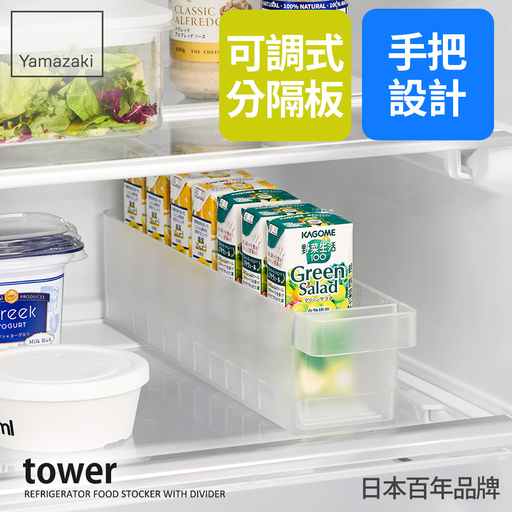 簡介 / | 日本【YAMAZAKI】tower冰箱分隔收納盒-窄型(白):★附2個活動式隔板★每格間距約2.8cm可自由調整隔板位置★附有把手,方便拉出收納盒,輕鬆取出盒內物品★開放式透明盒身方 |