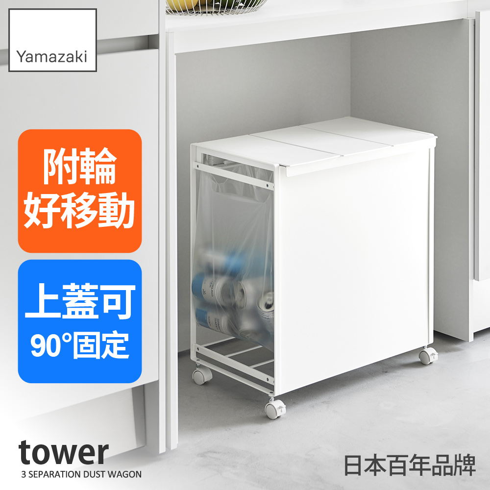 日本【YAMAZAKI】tower掀蓋式垃圾桶推車-3格(白)