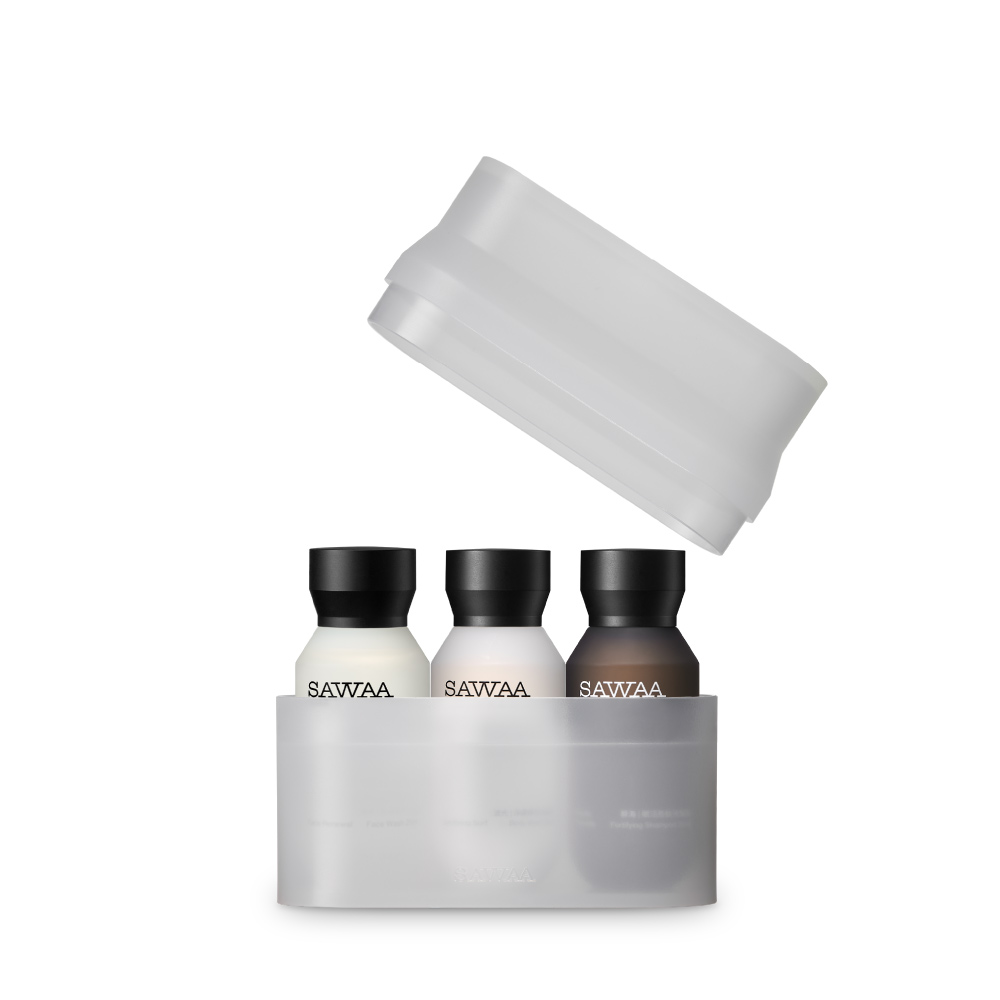 內容簡介 零度寫作|藻荇舒緩洗面露25ML:以白茅根部之萃取,與Aqualance™創造肌膚長效保濕作用,並以SAWAA精選的安全性高且對皮膚柔和之保濕與調理劑,使洗後膚感自然。波光|淨膚酵母沐浴露25ML :有效提升防禦力,沐浴過程中達到舒緩全身肌膚。靜海|賦活胜肽洗髮露25ML:選用雪絨花植萃與咖啡因植萃,活性深入滋養髮根,提高頭皮防護力,為髮根注入健康力量。