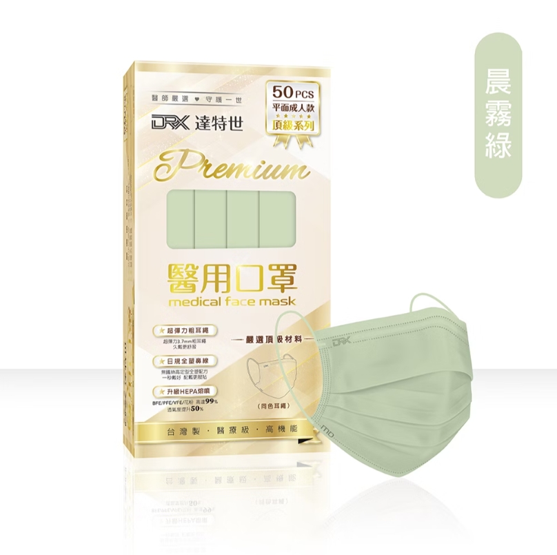 商品名 / | 【DRX達特世】醫用平面口罩-頂級系列-成人50入-晨霧綠 3入組 |