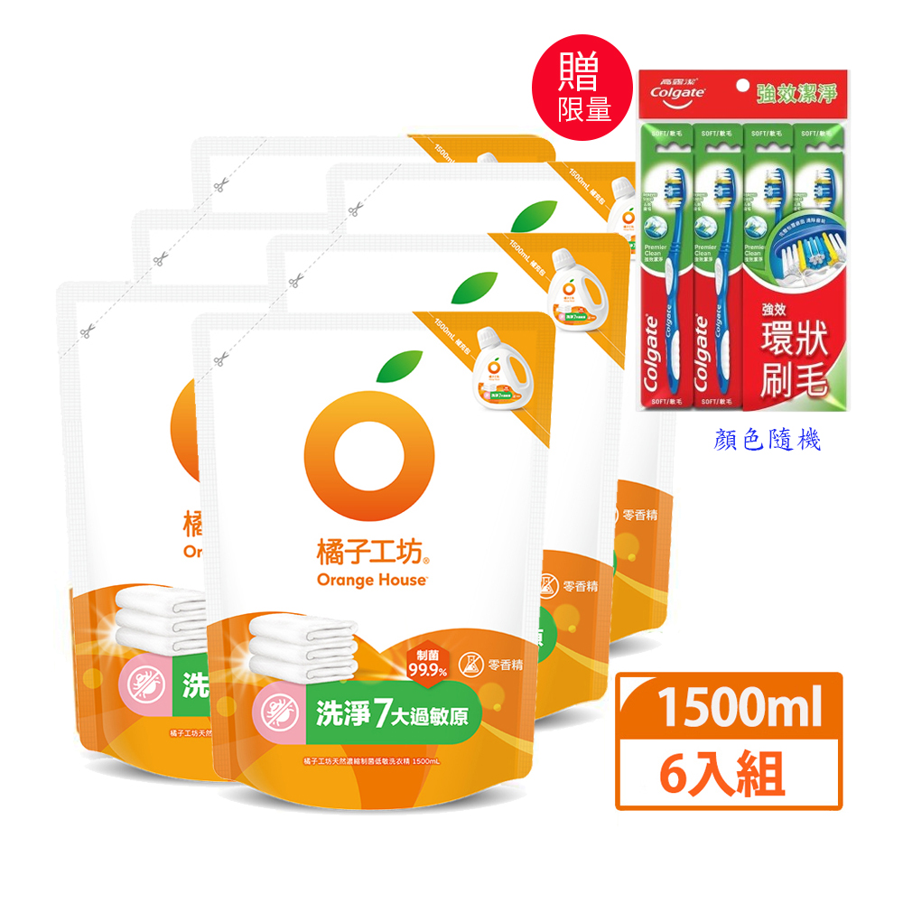 【橘子工坊】天然無香精制菌洗衣精1500ml (補充包)x6入(箱) 制菌低敏-限量加贈高露潔牙刷