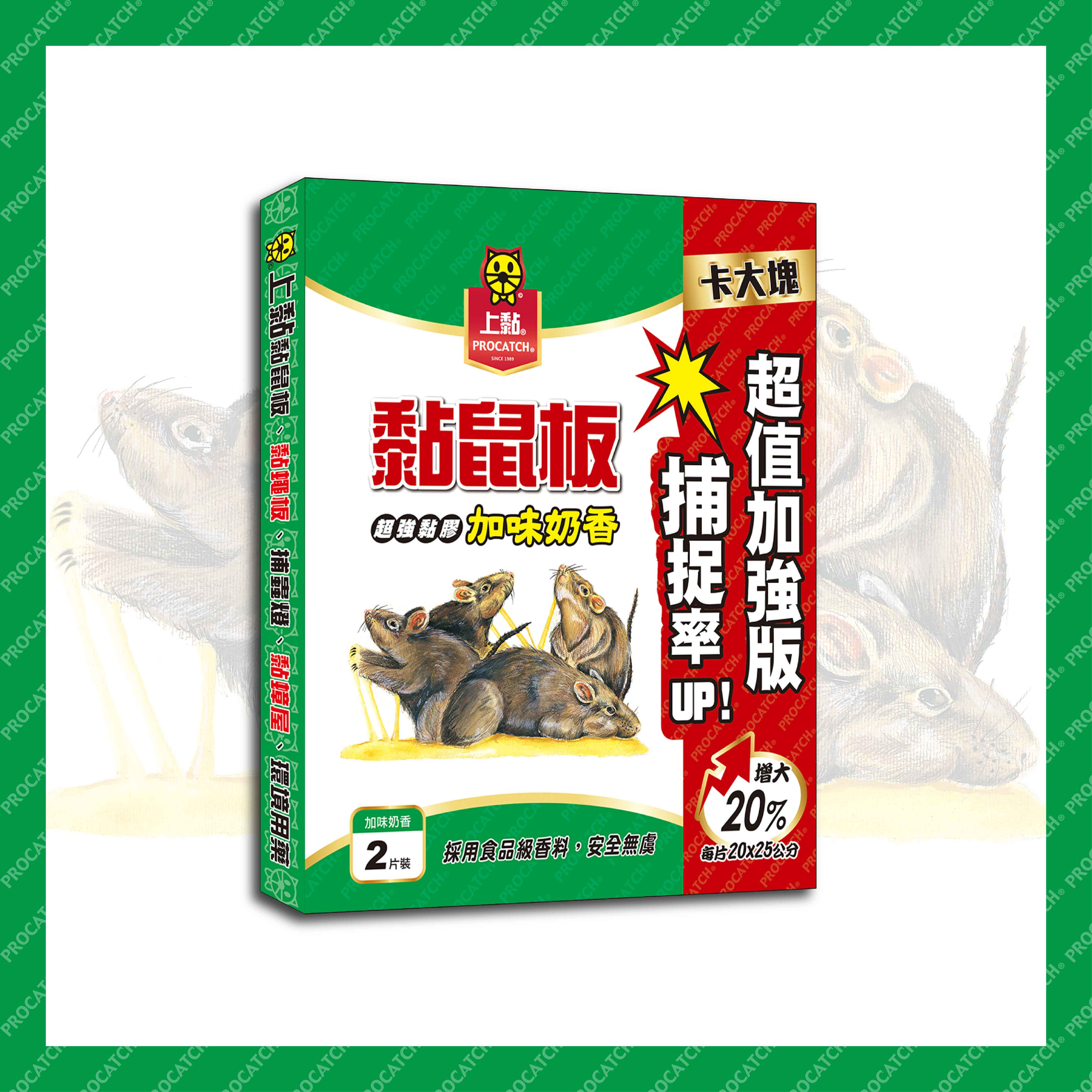 簡介 / | 【上黏】黏鼠板(土豆香味 加味奶香 肉味) 中型2入 盒*3組 加味奶香:增大20%,捕捉率UP!強力厚膠超強力黏性採用食品級香料,安全無虞不含環境用藥防水消光材質可置於老鼠 |