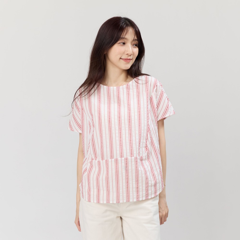好我 so that's me Debbie 方型小蓋袖拼接棉質直條上衣 紅白條 FREE SIZE