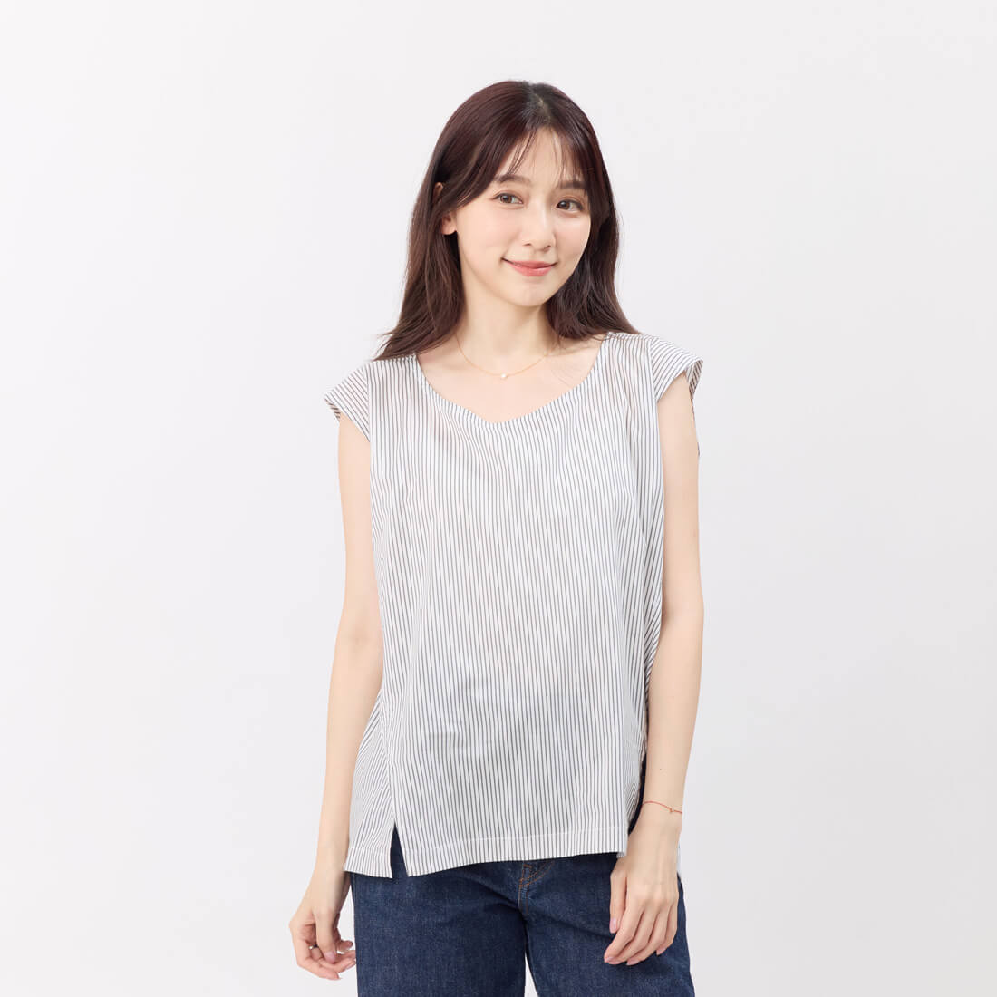 最佳賣點 : 灰白細直條的無袖設計充滿夏日清爽感,讓您在炎熱季節依然保持無負擔的穿搭體驗。透氣舒適的布料觸感即使在高溫下也不會感到黏膩,合適的肩寬和完美的手臂線條設計,讓整體穿著感更加合身舒適,展現出成熟優雅的魅力。