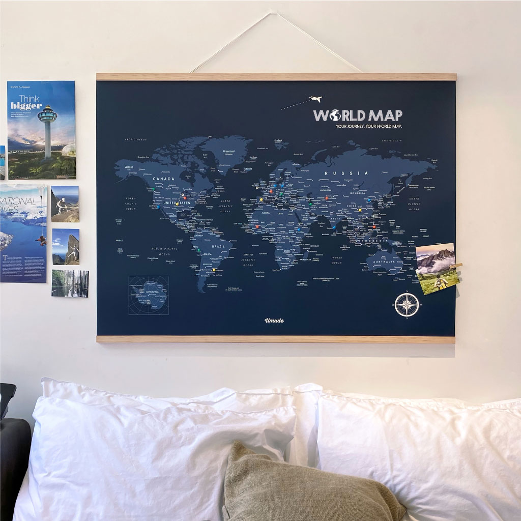 簡介 / | Umade 世界地圖木框海報 牆壁裝飾-海軍藍 大+亮彩磁鐵地標扣-混色15顆:不只好看,更有超過400個城市全部國家 首都 還有小島們✓獨家專利磁鐵地標扣✓台灣在地設計生產製造 |