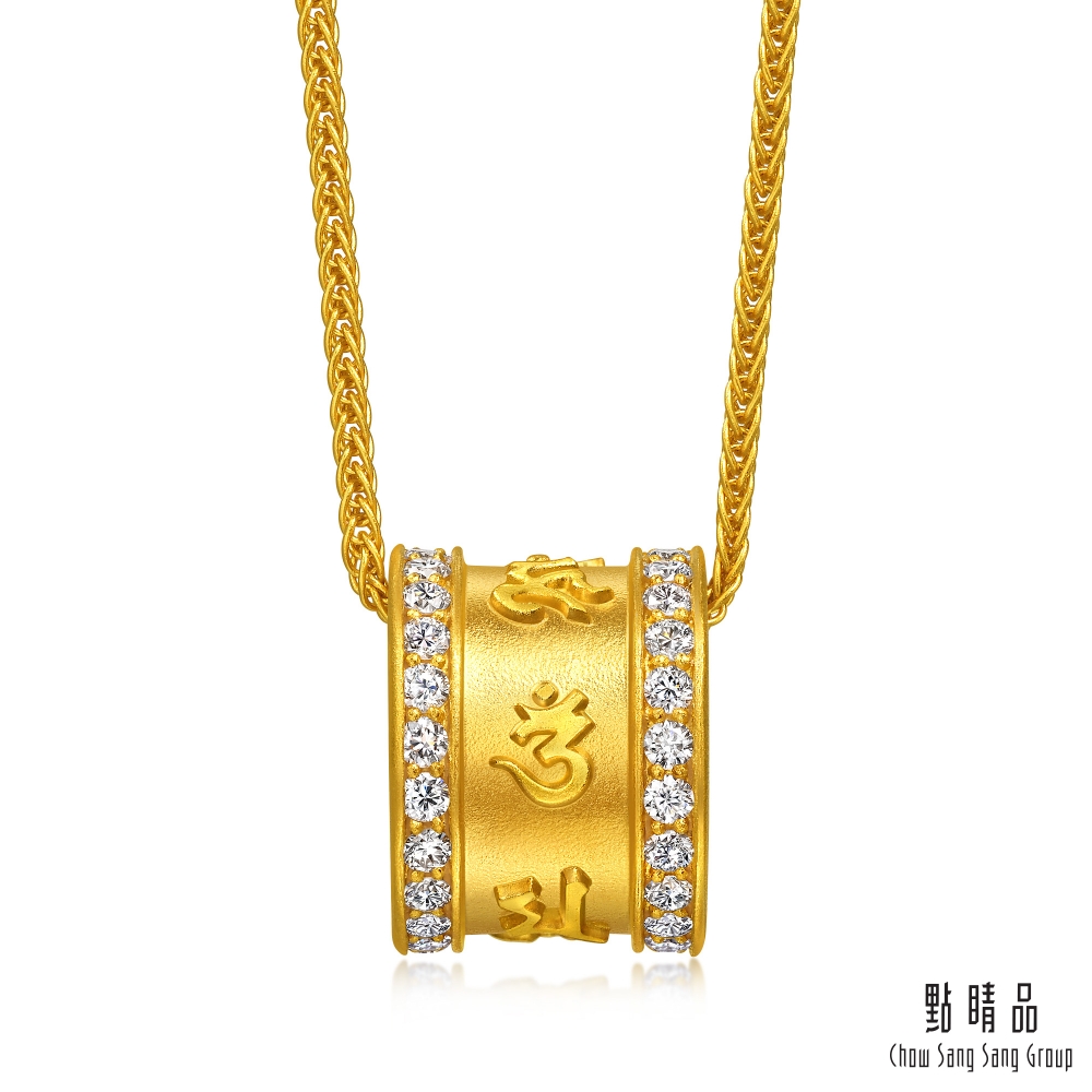 商品描述 | 點睛品 六字真言 鑽石黃金項鍊:以佛教轉經筒為設計靈感,古祖黃金工藝,刻鑄大明咒六字真言「唵嘛呢叭咪吽」,兩側閃耀美鑽。每轉動經筒,猶如誦讀經文,寓意祈求平安護身 |