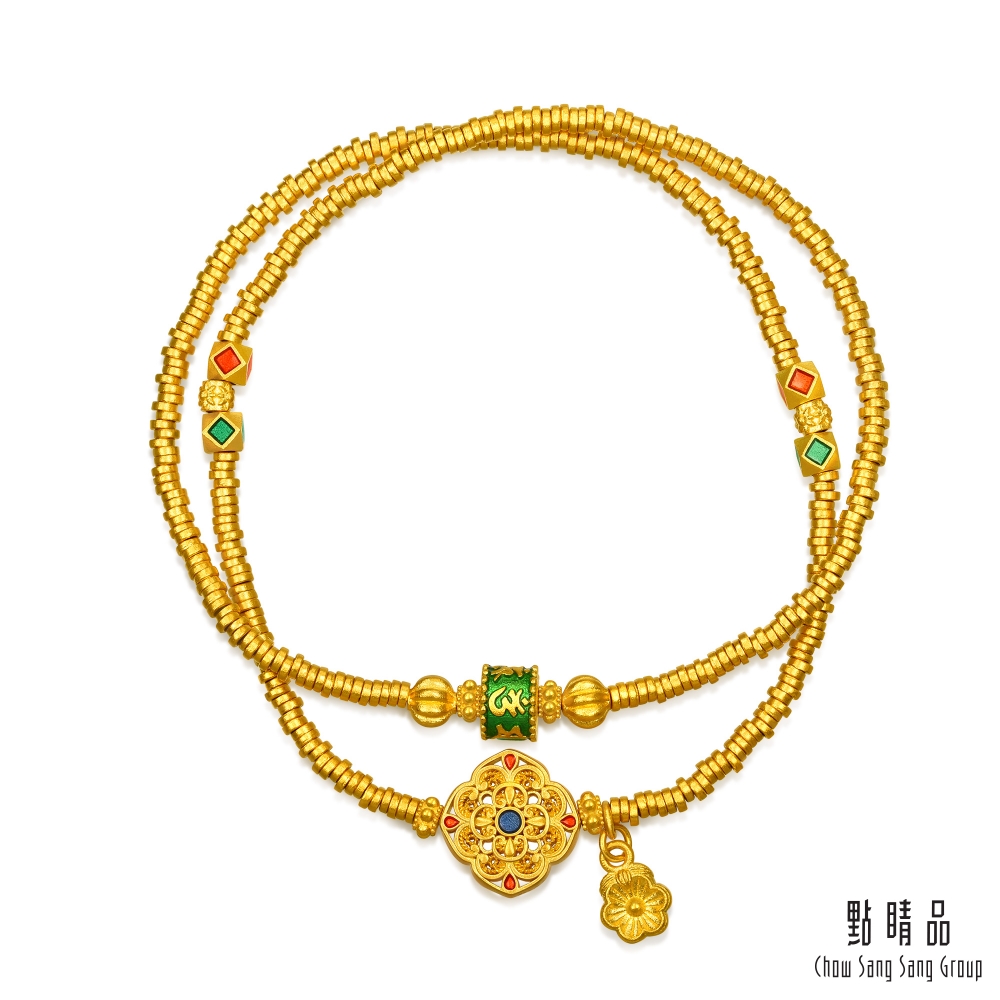 | 簡介 / | 點睛品 歲金如意 雙圈黃金手鍊_計價黃金:靈感源自古代碎銀子,採古祖黃金及彩繪塗層工藝,賦予細膩啞光質感,絢爛色彩相間其中,結合四合如意、大明咒六字真言、桃花及南 |