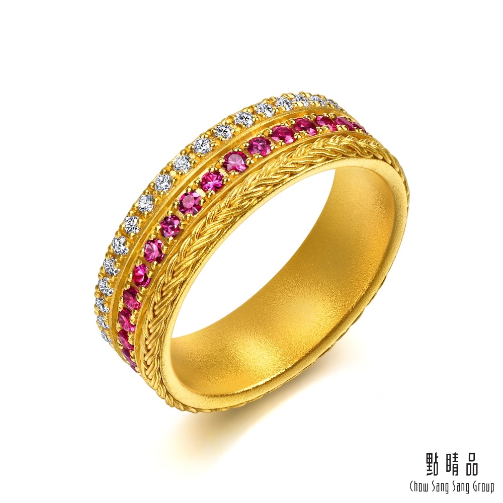 簡介 / | 點睛品 金穗錦繡 紅寶石 鑽石黃金戒指(女戒):古祖黃金工藝打造,手工拉絲編織,紋理立體有致,黃金細膩交纏,精鑲鑽石及紅寶石,更添尊貴,寓意「腰纏萬貫」、「財源滾滾 |