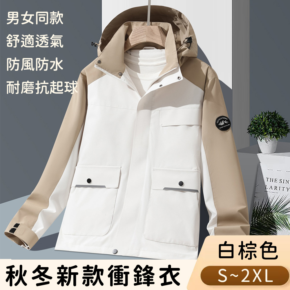 簡介 / 【悠行嚴選 YUGO】秋冬新款衝鋒衣 防潑水防風機能外套 男女同款-白棕色 XL:品名:秋冬新款衝鋒衣 防潑水防風機能外套 男女同款材質:100%聚酯纖維套裝組成:單件顏色:白