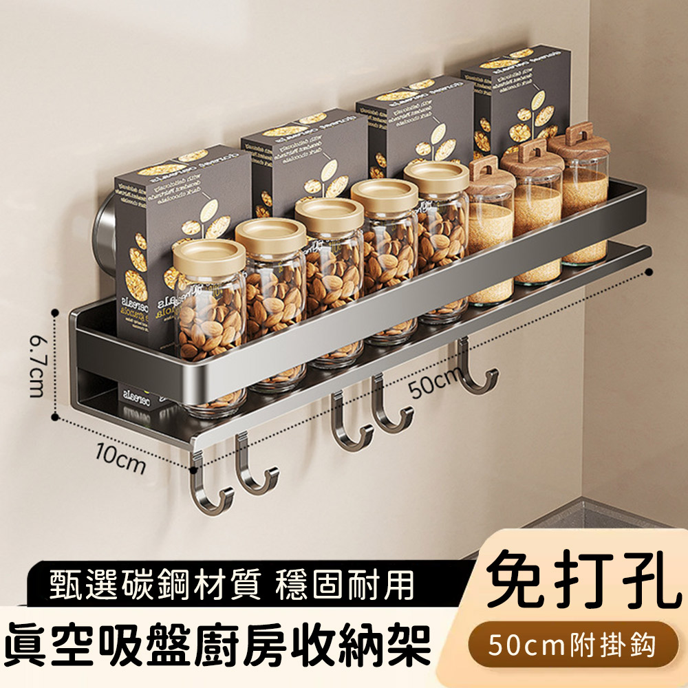 商品描述 | 【好拾選物】真空吸盤廚房收納架 免打孔壁掛 調味料收納 置物架附掛勾50cm:品名:【好拾選物】眞空吸盤廚房收納架/免打孔壁掛/調味料收納/置物架附掛勾50cm材質:碳鋼、表 |