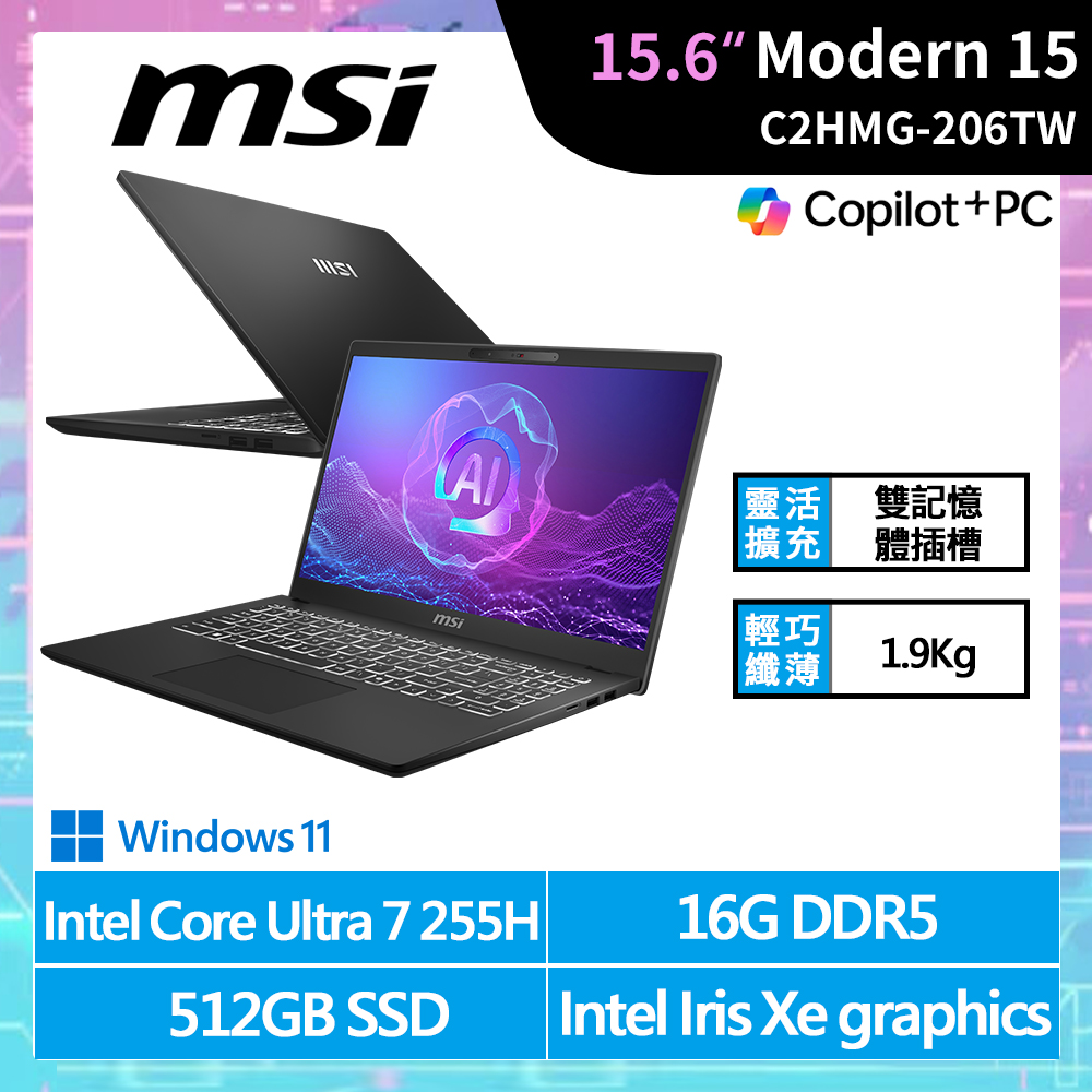 內容簡介 ◆商品型號:C2HMG-206TW-CBU7255H16GXXDX11MH◆螢幕:15.6" FHD (1920x1080), IPS-Level◆處理器:Intel Core Ultra 7 255H (2.0GHz Turbo 5.1GHz)(Cache 24MB)◆記憶體:16GB(8GB*2) DDR5◆記憶體支援容量(總插槽數量 總容量):2 64GB◆硬碟:512GB NVMe PCIe SSD◆硬碟支援擴充空間(包含已安裝部分):M.2 SSD *1◆顯示:Intel® Iris® Xe graphics◆插槽:2 Slots Number of SO-DIMM Slot1x M.2 SSD slot (NVMe PCIe Gen4)◆介面:3x Type-A USB3.2 Gen11x Micro SD Card Reader1x HDMI™ 2.1 (4K @ 60Hz)1x Type-C (USB3.2 Gen2 DisplayPort™ Power Delivery 3.0)◆網路:802.11 ax Wi-Fi 6E + Bluetooth v5.3◆電池及電源:3-Cell 39.3 53.8 Battery (Whr)、90W adapter◆重量:1.9 kg◆尺寸:359 x 241 x 19.6 mm◆光碟機:N◆攝影機:HD type (30fps@720p)3D Noise Reduction (3DNR)◆指紋辨識:N◆作業系統:Windows 11 Home◆保固:2年保固台灣地區2年到府收送免費客服電話0800-018880◆標準配件:變壓器+電源線◆NCC認證碼:CCAH16LP0540T0◆BSMI許可字號:R33008