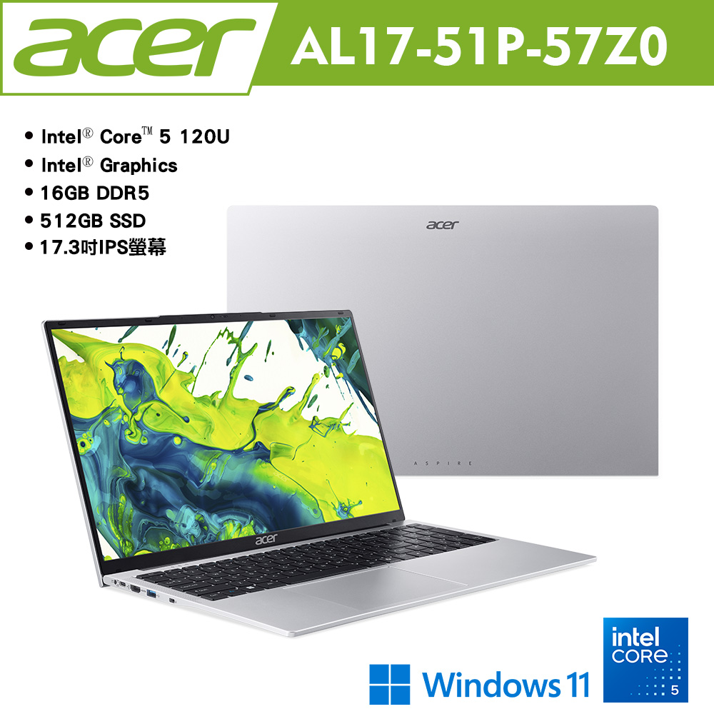 內容簡介 商品規格處理器:Intel® Core™ 5 processor 120U 10核心 12緒 1.4GHz 超頻 5.0GHz 12M Cache顯示卡:Intel® Graphics記憶體:16GB DDR5 共2個插槽,已使用1個,最大支援32GSSD硬碟:512GB PCIe NVMe SSD 共1個插槽,已使用1個傳統硬碟:無螢幕:17.3" IPS 霧面 LED背光 FHD 1920 x 1080 NTSC 45% 250 nits光碟機: NO作業系統:Windows 11無線規格: 802.11a b g n ac ax wireless LAN Dual Band (2.4 GHz and 5 GHz) MU-MIMOBluetooth® 5.1視訊鏡頭:2M FHD CameraCard Reader:Y(microSD™ Card reader)USB Type-C:1(USB 3.2 Gen 2)Type-C 支援影像傳輸:NUSB Type-A:3(USB 3.2 Gen 1)HDMI:Y HDMI1.4External display (VGA) port:NDisPlay Port:N可外接螢幕數量:2耳機 喇叭輸出:Y麥克風輸入:Y指紋辨識:N尺寸:396.4 (W) x 249.9 (D) x 19.9 (H) mm重量:2.0Kg變壓器:51W電池:45Wh保固:二年台灣地區完全保固 一年國際旅約保固 電池保固一年 第一年58分鐘快速完修備註:以上規格僅供參考,如有任何問題,請依原廠公告為主備註:不含包包及滑鼠※本賣場產品圖、產品功能、商品規格僅供參考,實品皆依原廠出貨為準,若有更改恕不另行通知。《拆封即代表同意以下注意事項,敬請詳閱》1.3C相關商品,為一次性包裝商品,不可拆封或試用,請務必確認有購買需求後再拆封。2.鑑賞(猶豫)期非試用期,辦理退換貨商品必須是完好狀態且需加裝外箱包裝,交付給前往取件的物流公司;請勿於商品原廠外盒上直接黏貼任何單據或書寫文字,否則將會影響退貨權限,此外也可能依照損毀程度扣除為回復原狀所必要的費用。3.客退回的商品必須是全新的狀態且包裝完整(含主機、包裝內外盒(含主機包裝膜及配件包裝膜)、配件、贈品、原廠內容物不得有人為損傷),切勿使用密碼鎖機功能、軟體升級、包膜、IMEI碼上網註冊、刷機及其他會破壞原廠軟體的操作,如有上述情形發生將不受理退換貨。★如商品有毀損或缺少,欲辦理退 換貨須酌收取15%~30%價值損失費用(詳細費用以檢測結果為準)★切勿破壞原廠外盒包裝,所贈予贈品請於鑑賞期過後再拆封使用,否則將無法接受退換貨。★電腦軟體屬於智慧財產保護權之一,均亨有相關法律權利,若不確定是否需要,請勿啟用,軟體啟用將無法退貨!★筆記型電腦 桌機 手機 平板等主機商品貨附贈之相關軟體、活動登入禮,鑑賞期內切勿上網註冊 (一經註冊恕無法接受退貨)。
