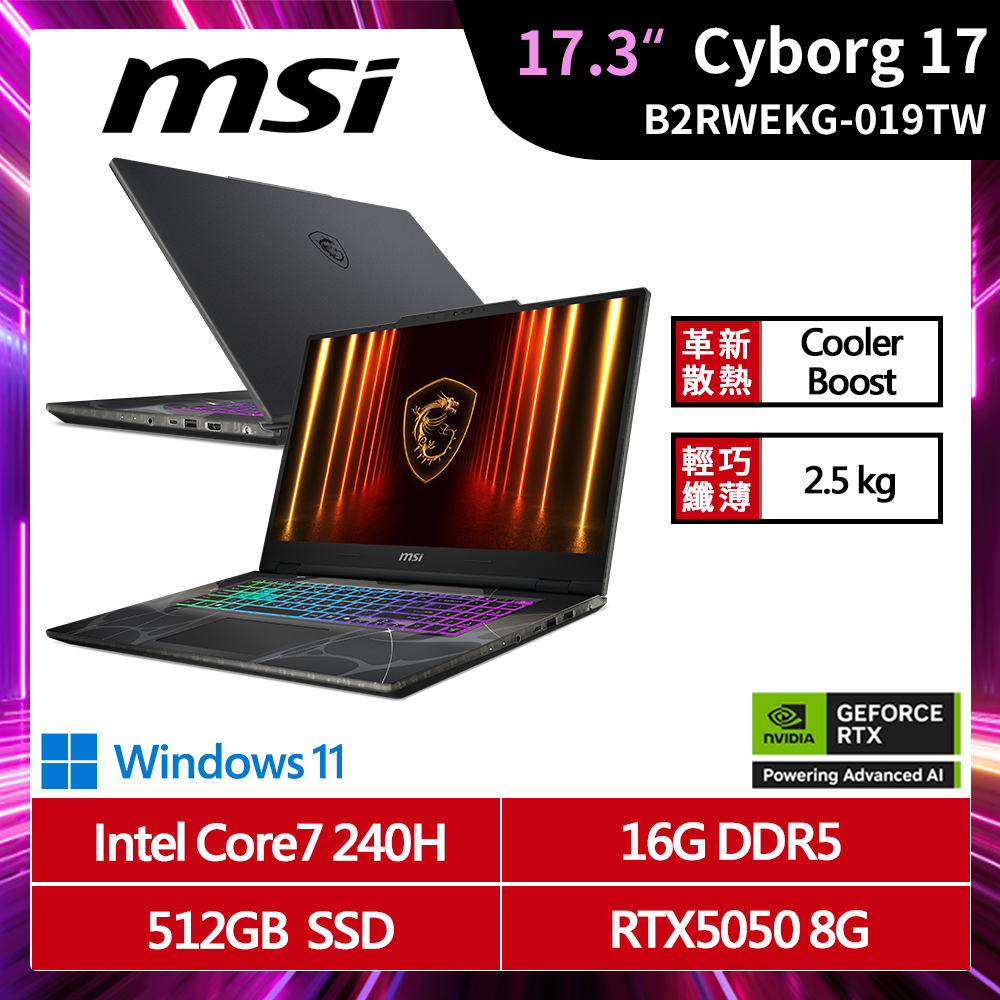 內容簡介 型號 Cyborg 17 B2RWEKG-019TW-TBC7240H16GXXDX11MH國際條碼 4711377369909螢幕尺寸及解析度 17.3" FHD (1920x1080), 144Hz, IPS-Level處理器 Intel® Core™ 7-240H (2.5GHz Turbo 5.2GHz)(Cache 24MB)主機板晶片 ---主記憶體 16GB(16GB*1) DDR5-5600 ,2Slots ,Max 96GB硬碟 512GB M.2 SSD (NVMe PCIe Gen4)顯示晶片規格 GeForce RTX™ 5050 Laptop GPU 8GB GDDR7插槽 2 Slots Number of SO-DIMM Slot1x M.2 SSD slot (NVMe PCIe Gen4)I O連接埠1x Type-C (USB3.2 Gen2 DisplayPort™ Power Delivery 3.0)2x Type-A USB3.2 Gen21x HDMI™ 2.1 (4K @ 60Hz)視訊鏡頭 HD type (30fps@720p)音效 2x 2W Speaker1x Mic-in Headphone-out Combo Jack光碟機 ---支援網路 Gb LAN802.11 ax Wi-Fi 6E + Bluetooth v5.3鍵盤 輸入裝置 4-Zone RGB Gaming Keyboard with Copilot Key電池 4-Cell55.2Whr Battery (Whr)變壓器 120W adapter作業系統 Windows 11 Home尺寸及重量399.3 x 258 x 21.2-22.2 mm2.5kg保固 2年保固台灣地區2年到府收送免費客服電話0800-018880配件 無