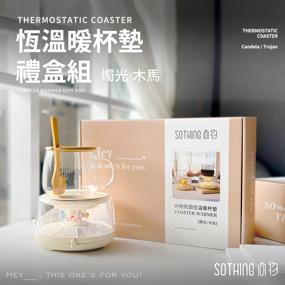 內容簡介 📍 向物氛圍恆溫暖杯墊 燭光 木馬✔精裝禮盒 ✔雙核加熱 ✔始終恆溫 ✔靜音運作 ✔氛圍圍繞. PTC雙核加熱,更快更迅速暖茶暖物. 智能恆溫,始終如一. 8小時安全斷電裝置,不怕小健忘. 低頻功率,多場景皆適用. 靜音運作,貼心陪伴不打擾. 內置防水膠圈,不怕液體滲漏. 不只暖飲暖茶,還能加熱小點心. 童趣場景設計,暖物還暖心. 精裝禮盒,送禮儀式感滿滿!【產品規格】品牌名稱:SOTHING 向物產品名稱:向物氛圍恆溫暖杯墊產品款式:燭光 木馬產品型號:DSHJ-S-2218A (燭光雙核) DSHJ-S-2218C (木馬雙核)產品尺寸:140 x 148 x 88.6 mm產品顏色:主體杏色額定頻率:60Hz額定電壓:110V額定功率:25WBSMI : R45673*兩種版本僅有中間裝飾物不同,其功能跟規格皆相同-【產品規格】品牌名稱:SOTHING 向物產品名稱:向物訂製耐熱玻璃杯套組產品款式:LOGO款 小花款產品尺寸:杯口8.5cm、杯底9.5cm、高度 8.2cm產品容量:450mL產品重量:10g產品材質:高硼矽玻璃使用溫度:-20度~150度(攝氏)-【包裝清單】主機 x1、說明書 x1、玻璃馬克杯 x1、竹製上蓋 x1、竹製湯匙 x1【保固】12個月 (僅保固主機)【特別注意】⚠️ 產品保固期限統一依照上述商品內文說明為準。⚠️ 保固商品務必保留完整包裝,以免喪失保固權益。⚠️ 如遇新品瑕疵,請於7日鑑賞期內進行退換貨申請,逾期恕不受理。⚠️ 收到包裹後請務必進行開箱錄影,並請一鏡到底以保障雙方權益。【特別說明】1.使用本產品前,請先將發熱盤表面之貼紙移除!避免高溫產生貼紙加熱的氣味。2.建議使用本店販售之”耐熱玻璃杯”導熱效果較佳,為避免危險請勿使用金屬、木質、無耐熱塑膠等材質之容器,陶瓷杯、雙層隔熱玻璃杯由於有隔熱作用或底座較厚的情形,導熱效果較差,請斟酌評估使用。3.液體溫度與升溫速度會因不同室溫、容量、容器材質有所差異。4.追求快速導熱,請使用本店販售之”耐熱玻璃杯”並請蓋上杯蓋,方可鎖住熱能達到期望溫度。
