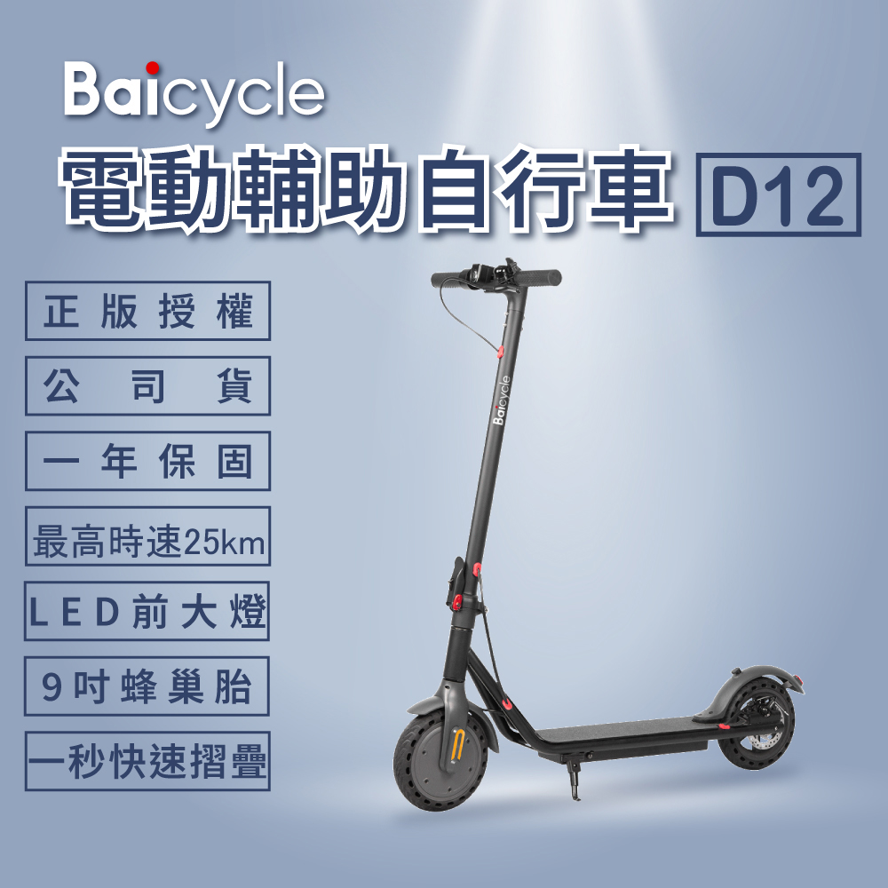 商品描述 | Baicycle D12 9吋智能折疊電動滑板車:*9吋蜂巢實心胎,騎乘舒適*最高時速25公里(空車測試須依實際路況及載重而定)*高亮LED前大燈,尾部警示燈*搭配碟煞系統,前電子煞+後碟煞 |