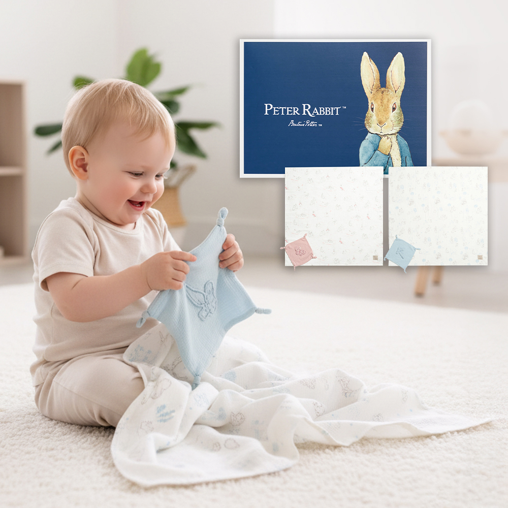 【奇哥】比得兔天絲泡泡紗包巾安撫禮盒 120x120cm 2色選擇 水綠色 包巾+安撫巾 寶寶新生兒禮 彌月禮 嬰兒禮盒