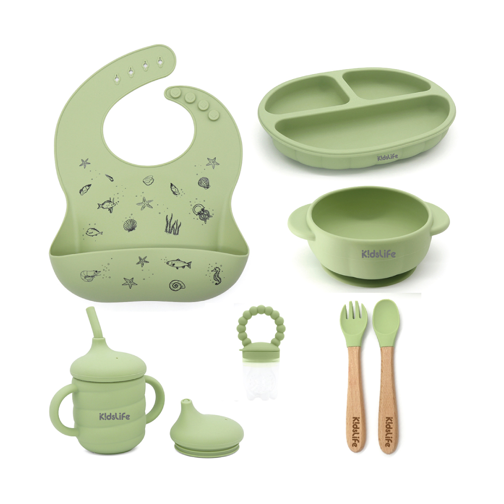 | 簡介 / | KidsLife 寶寶餐具彌月禮盒 A款 橄欖綠:▪內含:矽膠圍兜、矽膠餐盤、矽膠餐碗、矽膠杯、矽膠餵食奶嘴、矽膠勺叉▪矽膠餐碗、餐盤:底部吸盤設計,牢牢吸附桌面,幼兒不易打 |