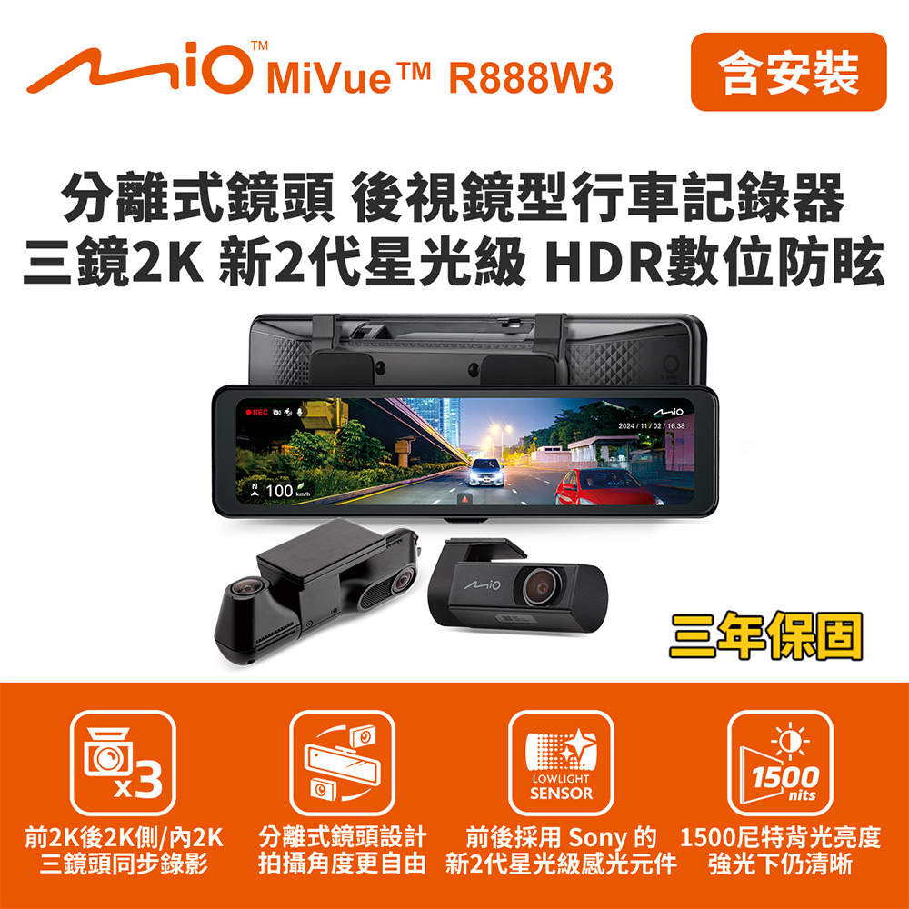 內容簡介 Mio MiVue R888W3分離式鏡頭 後視鏡型行車記錄器三鏡2K 新2代星光級 HDR數位防眩(送-128G卡)含到府安裝◆特點推薦★前2K後2K側 內2K 三鏡頭高解析同步錄影★獨家!1500 nits 高亮度螢幕背光模組★高亮度低反光無疊影 螢幕清晰同級之最★鏡頭與主機分離式設計 視野零遮角★採用 Sony 的新2代星光級感光元件★安全預警九合一 GPS 測速警示★內建二合一駐車模式◆產品介紹☆★☆手機隨掃QR Code即連線WIFI☆★☆【影片】◆商品規格品名:Mio MiVue R888W3 3鏡頭後視鏡型行車記錄器BSMI字號:R45630 NCC字號:CCAM24LP1390T3主機尺寸:73.8 x 281 x 24 mm前鏡頭尺寸:25.7 x 69.85 x 28.9 mm後鏡頭尺寸:34.4 x 117.8 x 40.4mm主機重量:390g前鏡頭重量:43.6 g後鏡頭重量:85 g保固範圍:新品暇疵保固期限:原廠保固3年產地:中國貼心提醒 : 車內後鏡頭影像會受隔熱紙影響,如:透光度低,影像收錄效果不佳;內反光會造成鏡頭同時錄製車內反射影像,並顯示在螢幕上。注意事項:1.視車款,安裝費用若需另外加費,會請專人與您聯繫說明(例如:歐系車款..)2.若安裝地區較偏遠,會安排到店安裝,會請專人與您聯繫說明(例如:花蓮、台東)◆Mio 客服專線 (台灣區)客服專線 :(03)286-6668安裝專線 :(02)22686123◆服務時間 星期一至星期五 09:00 AM – 12:00PM01:00 PM – 06:00 PM注意: 下列規格若有變更,恕不另行通知。同一產品之規格、功能及其上提供之服務將因銷售地區之不同而異,實際內容請以購買當地機種為準。 (如有問題請洽 Mio 客服專線)◆我們所提供為全新產品,並提供以下保證- 保固期限:原廠保固3年- 保固範圍:新品瑕疪(因人為因素所導致產品損壞者恕不接受保固) - 本產品已通過BSMI標準檢驗局認證標準,字號R45630,品質有保障◆退(換)貨注意事項:1、本商品未確定購買前嚴禁使用!否將影響您退換貨權利。2、本商品並不提供免費試用(猶豫期並非試用期),除新品故障瑕疵外,凡經操作使用與包裝不完全造成商品損壞或污穢,將影響您退、換貨權益!猶豫期間內請妥善保護相關物件。3、請保留原包裝袋、紙箱!退貨時請以原裝袋、紙箱包裝退回,包裝不完全造成商品損壞恕將影響您退貨權益。 4、(如有贈品)贈品隨貨品附上!遺失或損壞將影響您退貨權益。◆配送注意事項:本產品係由供應商提供台灣本島(貨運一般區)免費商品運送服務。若指定配送區為離島、花東與偏遠特殊地區,將不在此(免費)服務範圍內!