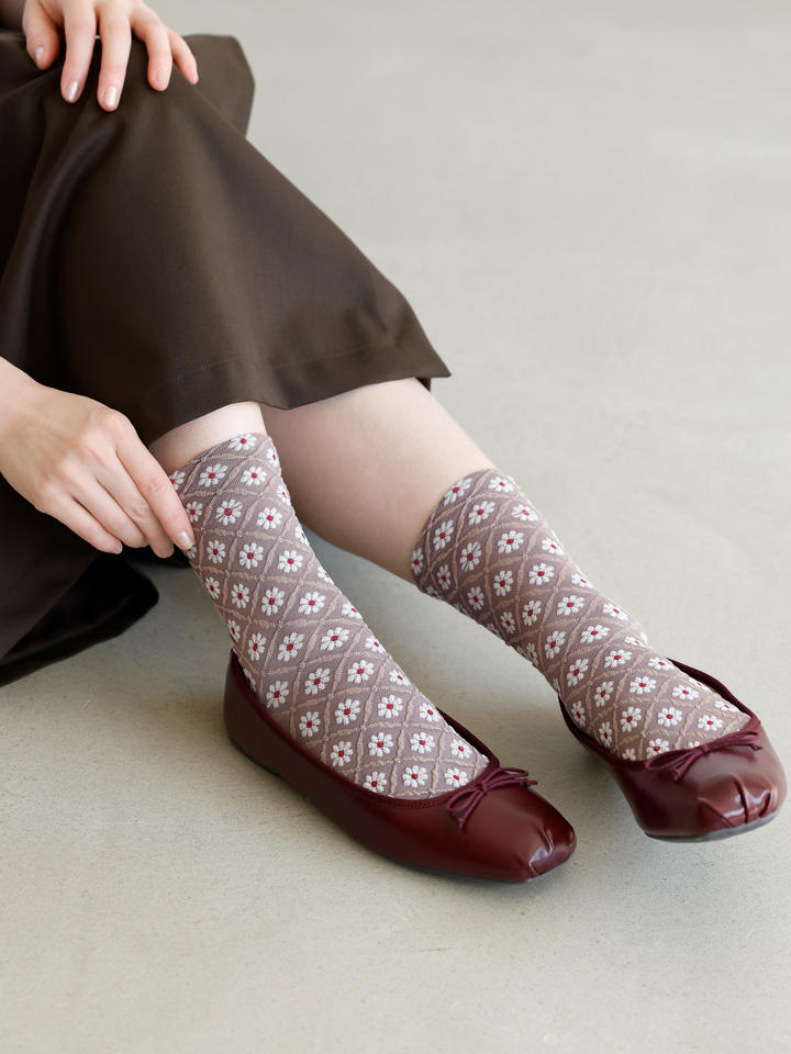 日本 Tabio 立體編織菱格紋花花中筒襪 25 Mochacha