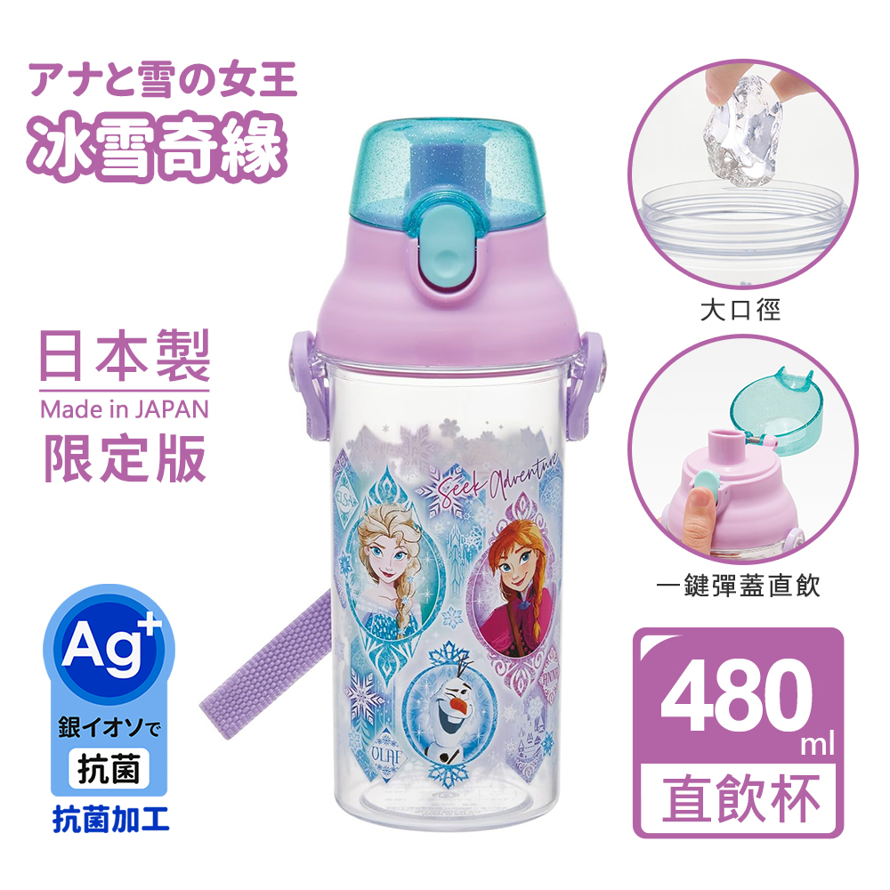 【百科良品】日本製 冰雪奇緣 彈蓋直飲水壺 抗菌加工 480ML(附背帶) 冰雪大冒險-透明瓶身