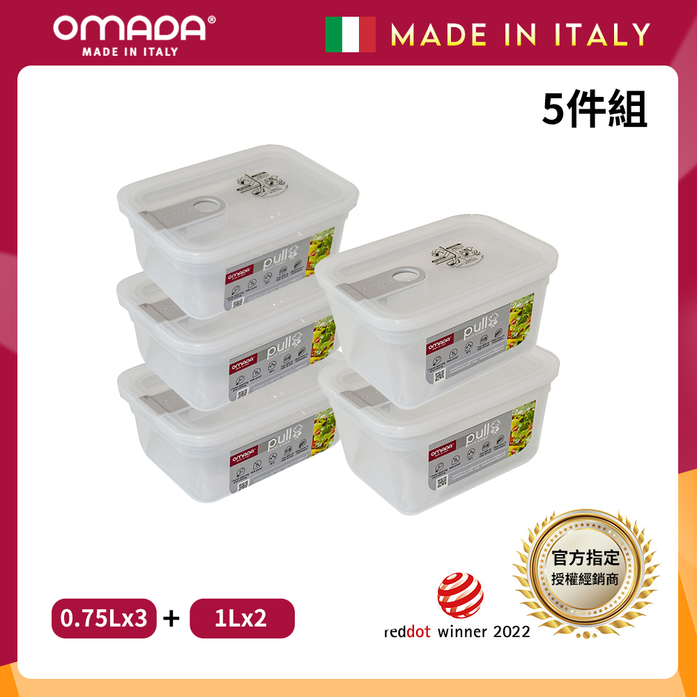 商品描述 【OMADA】義大利製 主廚CHEF 易拉 保鮮盒0.75Lx3+1Lx2(實用五件組) 灰色:★100%義大利設計製造★單手就能打開,一拉輕鬆開,一壓即蓋★食品級材質,通過TUV和SGS檢測認證