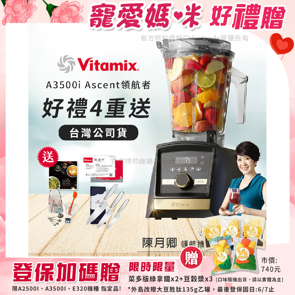 | 商品描述 | 【美國Vitamix】A3500i Gold Label 超跑級調理機 全球限定款 智能x果汁機 尊爵級(官方公司貨)陳月卿推薦 超值豪禮(工具組+日本極KEEMAKE 三刀組-三德+蔬果小刀+牛刀)) 海軍 |