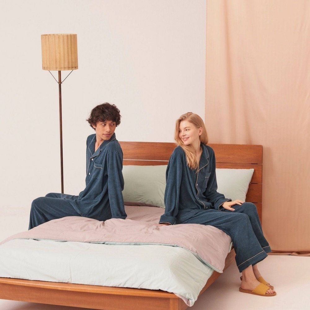 內容簡介 「Foo Tokyo」獨家開發了一種特殊的棉質睡衣,將兩種天然纖維結合在一起。這種特殊的紗線稱為「維多利亞美利奴羊毛」,是由天然纖維「長纖SUPIMA匹馬棉」和少量的「美麗諾羊毛」以Foo Tokyo獨特的配方相結合所創造出來的。這樣一來,穿著觸感就像是穿著絲綢一般輕盈柔滑,同時穿著活動時不會有壓力感。「維多利亞美利奴羊毛」採用了非常稀有的EXTRA FINE等級。保留了羊毛的保暖效果和除臭效果,同時打破了人們對羊毛「刺癢」和「易悶熱」的印象,誕生了最頂級的舒適棉質睡衣。在洗滌護理方面,可以像普通衣物一樣,使用家用洗衣機進行清洗即可。在清洗時,為防止毛絨脫落,請放入洗衣專用網後再投入洗衣機清洗。本款特別的棉質睡衣採用了稱為「Flat Seamer(平縫)」的縫製方法。這是一種技術難度極高的特殊縫紉方式,使用了特殊的四針縫製機,使得布料與布料之間的縫線變得平坦,消除了突起,使其不再有粗糙感。為了不損害肌膚觸感,每一處縫線都由日本裁縫師傅手工處理。這是一款注重設計和舒適度的特別棉質睡衣。【商品規格】上衣尺寸:S(145-155cm):胸圍96cm,袖長49cm,肩寬43cm,全長62cmM(155-165cm):胸圍102cm,袖長53cm,肩寬45cm,全長66cmL(165-175cm):胸圍108cm,袖長56cm,肩寬47cm,全長70cmLL(175-185cm):胸圍114cm,袖長60cm,肩寬49cm,全長74cm長褲尺寸:S(145-155cm):腰圍65cm,臀圍94cm,大腿寬32cm,全長85mM(155-165cm):腰圍70cm,臀圍99cm,大腿寬33cm,全長90cmL(165-175cm):腰圍75cm,臀圍104cm,大腿寬35cm,全長94cmLL(175-185cm):腰圍80cm,臀圍109cm,大腿寬36cm,全長99cm女模特兒:165cm 試穿M男模特兒:178cm 試穿L材質: 58%棉 26%羊毛 16%聚酯纖維顏色: 綠松色產地:日本
